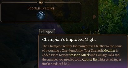 - 3级:冠军之力:你的熟练加值将两次添加到武器攻击和伤害掷骰中,并且你获得临界命中的几率提高2点