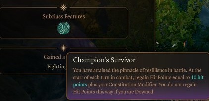 - 18级:冠军幸存者:在每次战斗的回合开始时,恢复等于10 + 体质调整值的生命值。如果你被击倒或死亡,则不会恢复生命值。你还可选择第三个战斗风格