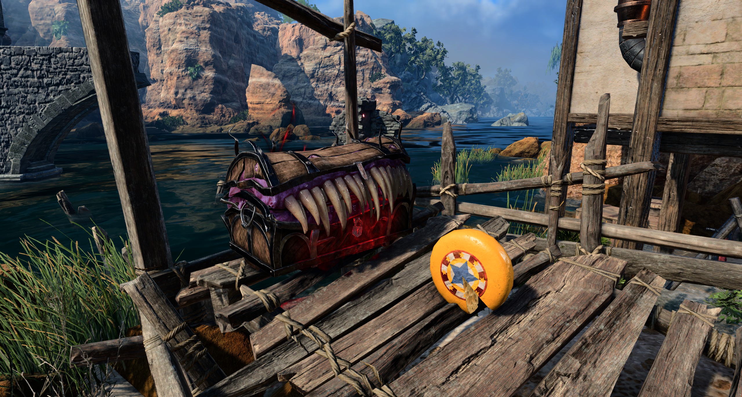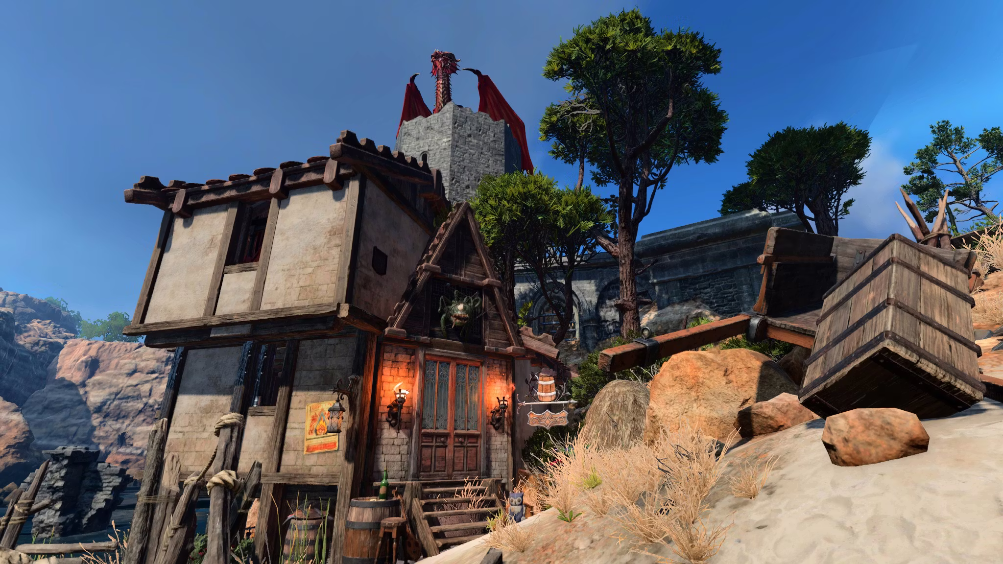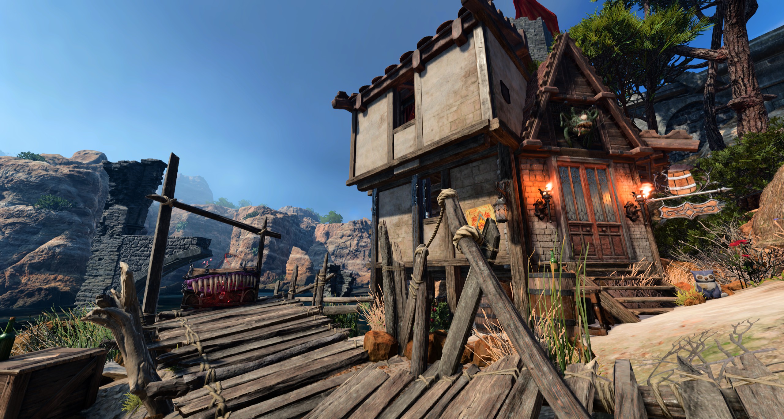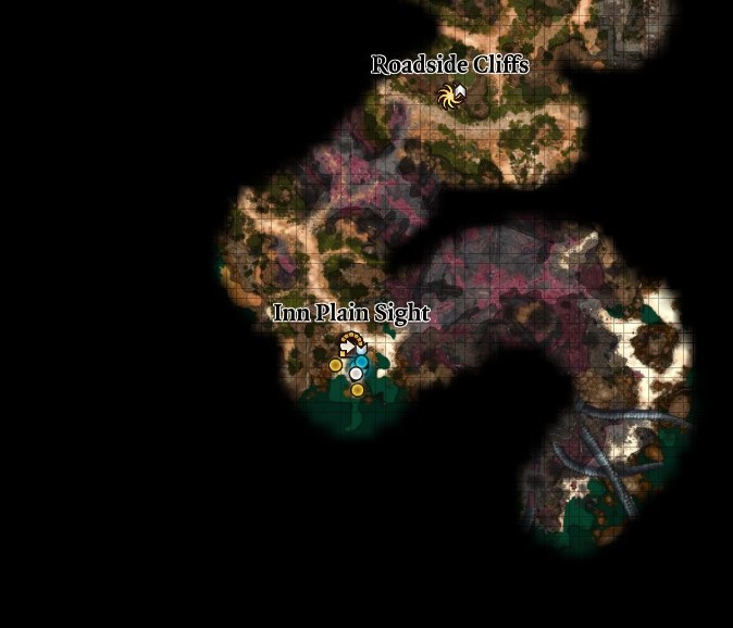商人的位置位于地图东南部的一个新区域中,紧邻起始地点,在与 Astarion 的第一次遭遇之前。‘Inn Plain Sight’ 是一座几乎完全由可破坏材料建造的新建筑——所以请随意带上你的 Runepowder 桶桶尽情破坏吧!这座旅馆及其周围的废墟的设计灵感大致来源于《龙与地下城:红龙的故事》LEGO 套装,尽管我必须强调“大致”这个词,因为建造时也采取了一些创意上的自由。我在该地点周围还留下了一些小彩蛋哦!