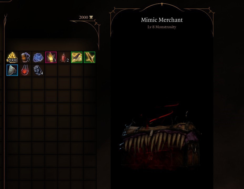 此模组在第一章开始时添加了一个新的非传统商人。它将出售诸如Mithral 原矿、Sussur 武器、Runepowder 和 Noblestalk等物品的替代品。此外,它还会出售第二个铁壶,这样你就可以保留一个铁壶的同时完成交还任务。商人还可以访问教程宝箱的内容,并因此能够出售放置在其中的模组物品。商人也会出售其他一些杂项物品。