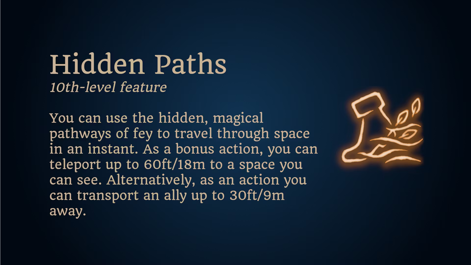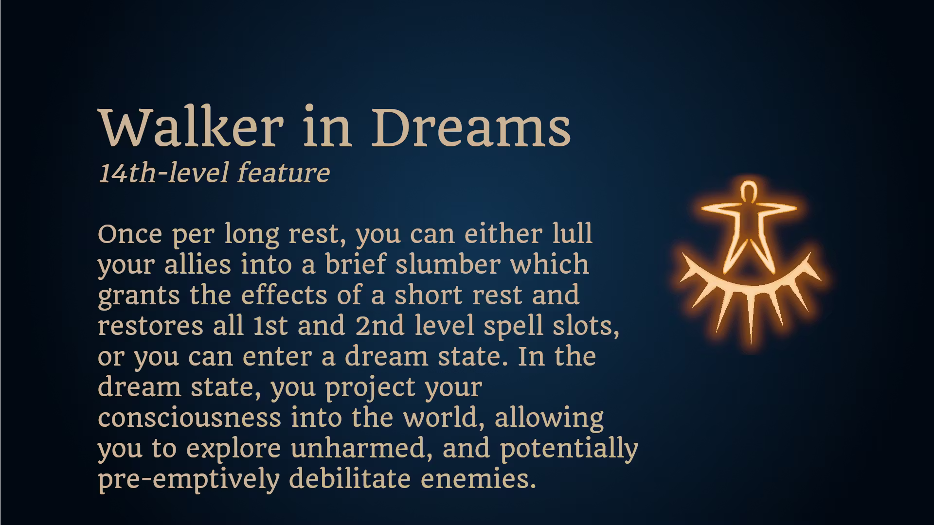你可以在梦中移动到任何你知道的地方。使用一个动作,你可以进入梦境并传送到另一个地方,距离不超过30英尺(9米)。当你到达目的地时,你会从梦境状态醒来。