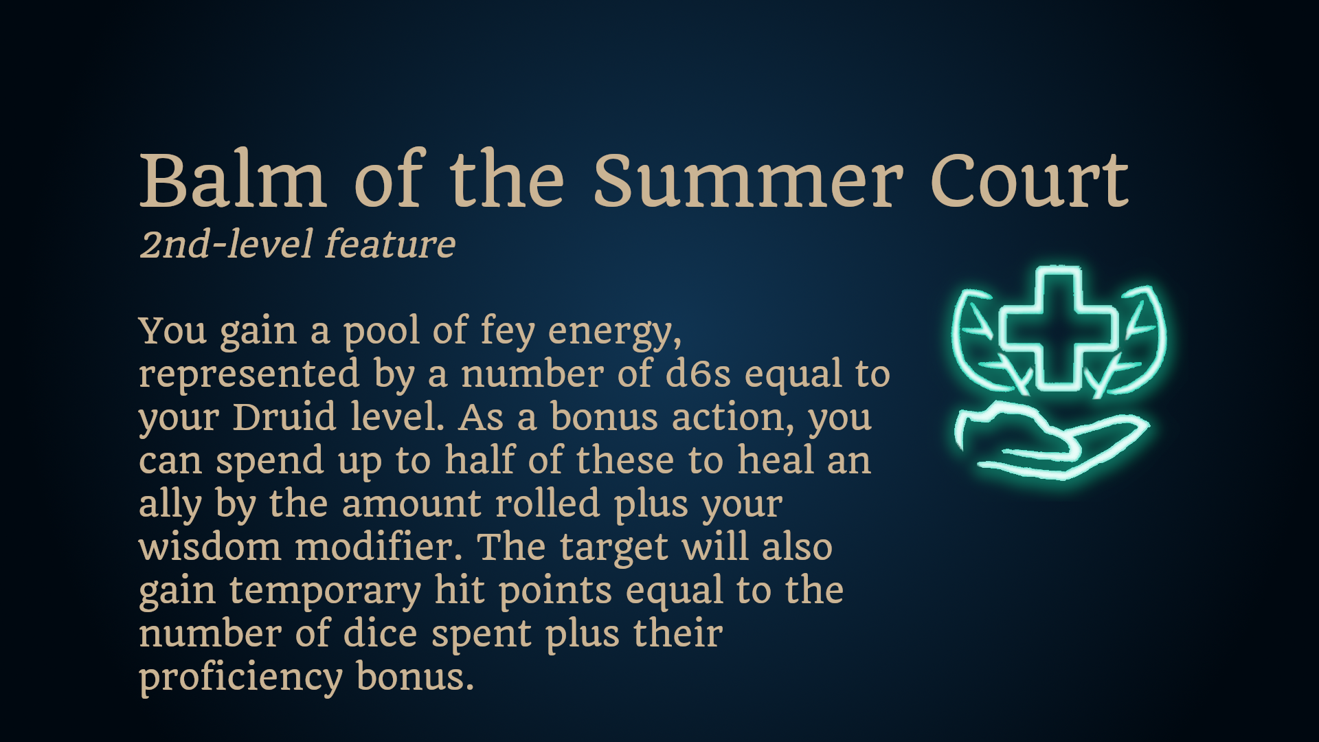 你获得了代表治愈能量的骰子池,数量等于你的德鲁伊等级。你可以一次消耗最多一半(向上取整)的骰子来为盟友恢复生命值,数值等于掷出的结果加上你的智慧属性调整值。此外,目标还会获得临时生命值,数值等于所花费的骰子数加上他们的熟练加成。