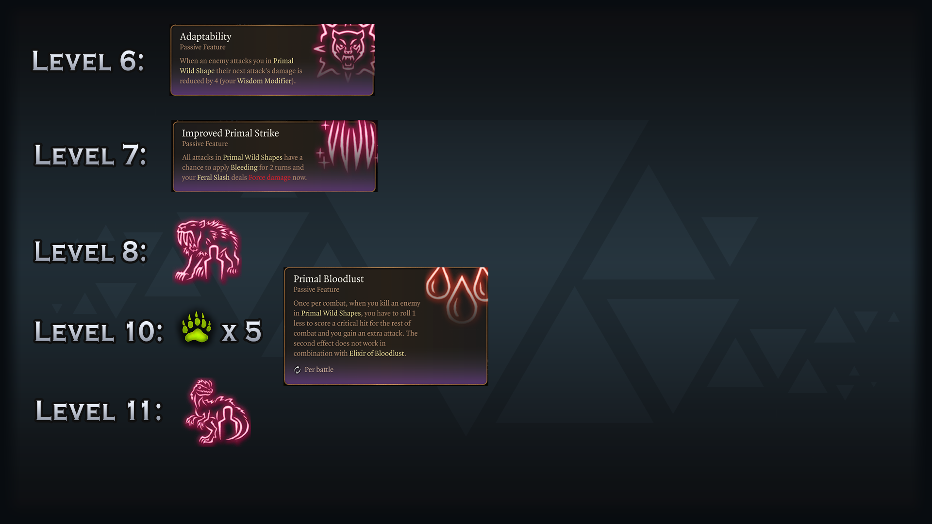 - 爪之圆圈 – 使用牙齿和利爪释放自然的力量,短暂但强大的原始野兽形态