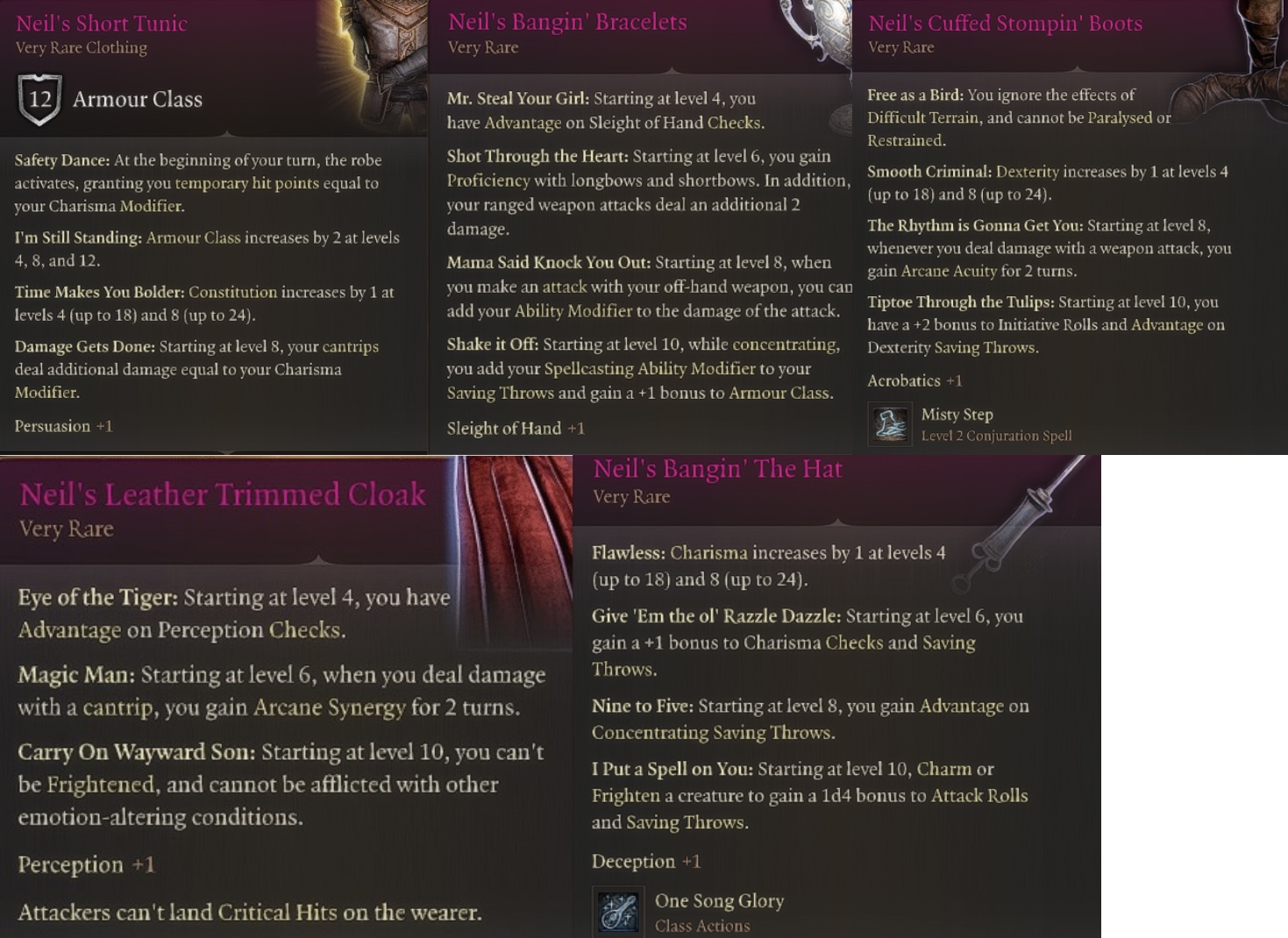 为了终极摇滚乐手体验,所有装备都可以染色,并且适合所有身体类型(除上述例外情况)。在教程箱中可用,或者可以在第一幕的 Dammon、第二幕的 Moonrise 的 Bugbear 或第三幕的 Popper 处购买。