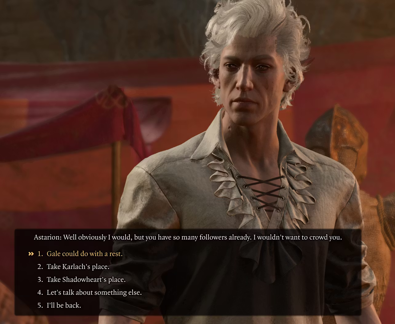 当角色离开队伍、留在团队中并在到达营地时,他们将切换到休闲装直到返回。前提是他们的身体护甲是保护性的——Gale 的长袍足够舒适可以作为休息服装,但即使是加垫的装甲也“几乎令人难以忍受地汗流浃背”。
