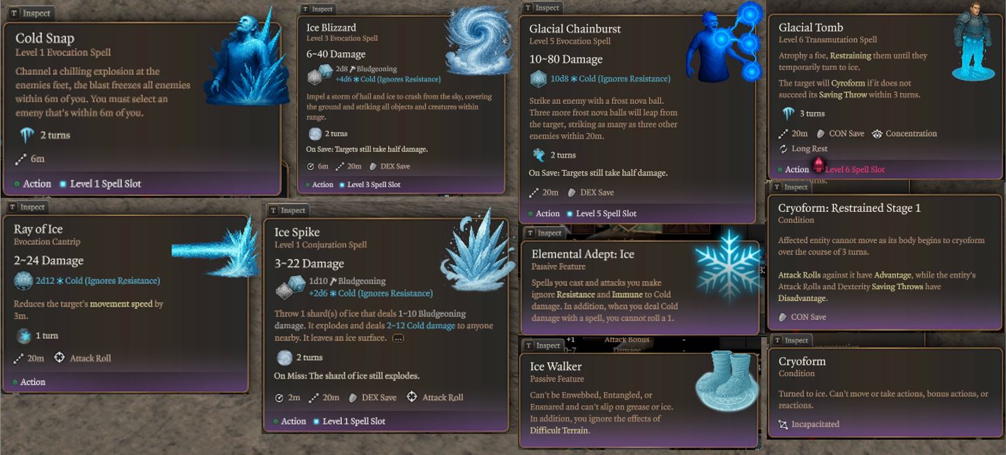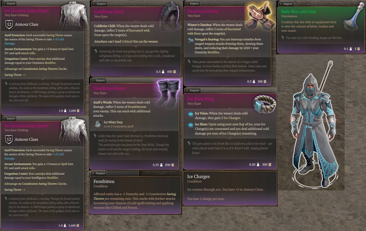 2025年8月31日:添加了“冰爆戒指”,增强了“霜冻靴”的效果,现在可以持续两回合的霜冻状态,并且“寒雾步”可以在仅消耗额外动作的情况下随时使用,施法距离为22米。我也调整了靴子的描述以更好地说明何时会触发“霜冻”。移除了手套上的+2护甲加成,因为冰爆现在提供这一效果。