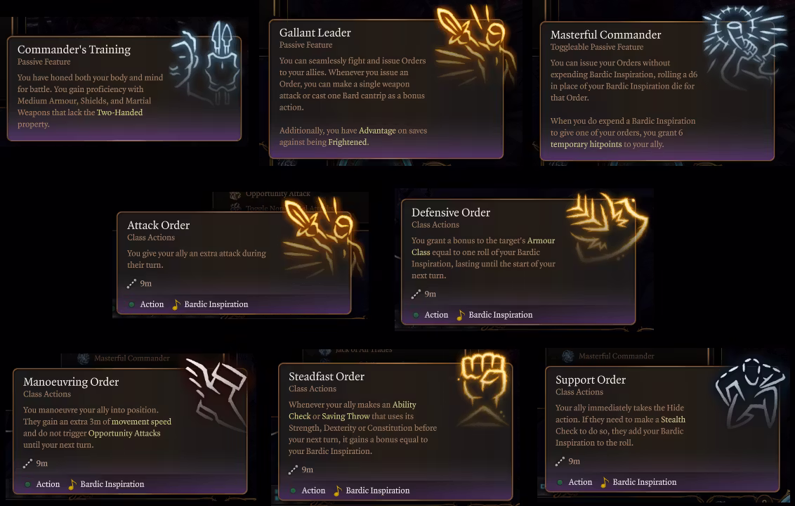 指挥学院是一个专为希望带领盟友作战的吟游诗人设计的子类。虽然他们本身不是糟糕的战斗者,但指挥学院的学生在与盟友并肩作战时表现最佳。他们会下达命令,在战场上调动盟友,并总体上起到领导朋友取得最终胜利的作用。这个子类是基于LaserLlama 的原创作品。