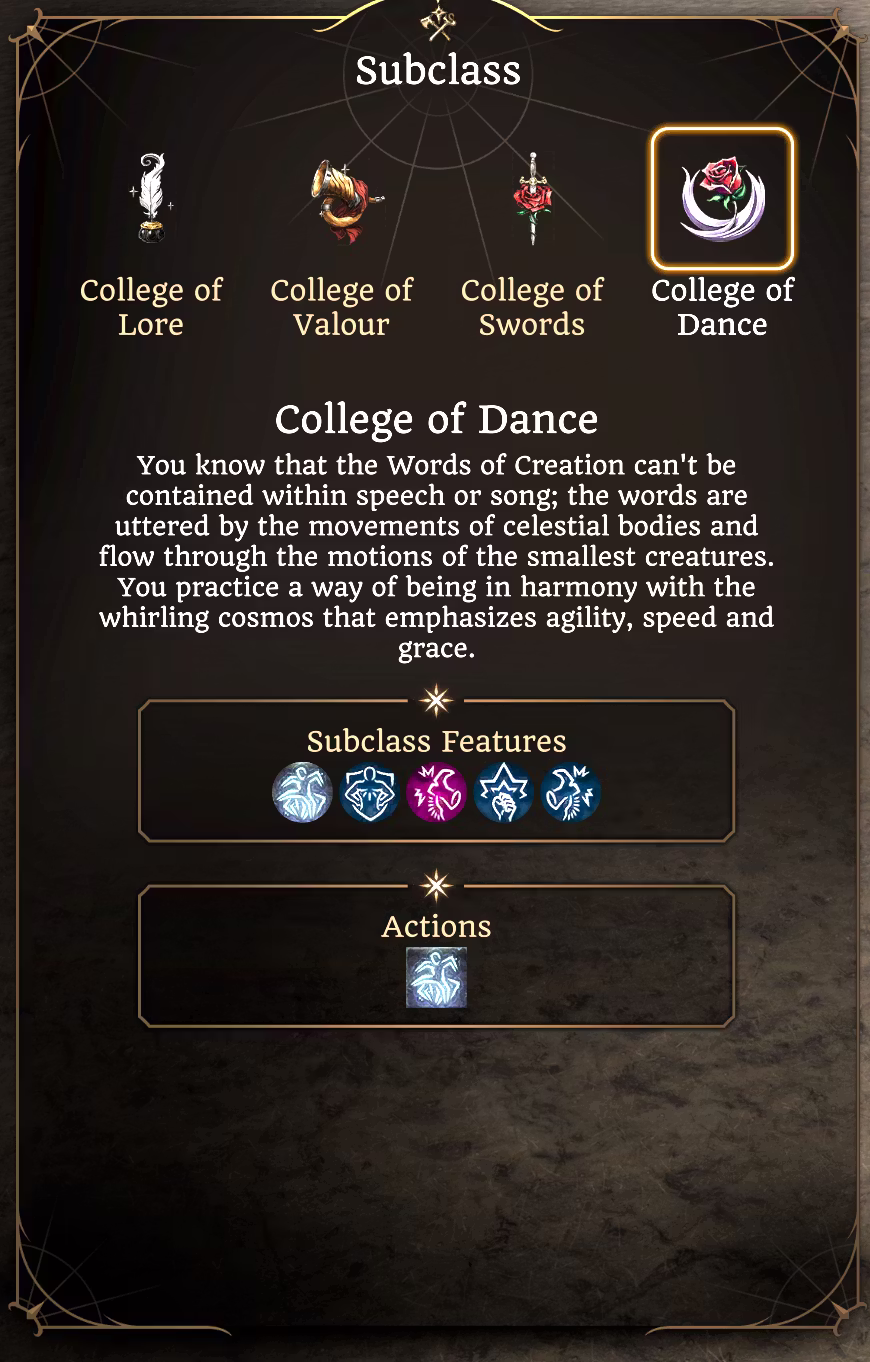 将《玩家手册》2024年版中新的游侠子职“舞蹈学院”引入《博德之门3》。新模组包含被动技能、能力、反应,以及全新的图标和视觉效果等。此模组实现了所有新子职的特性,并且功能完整。