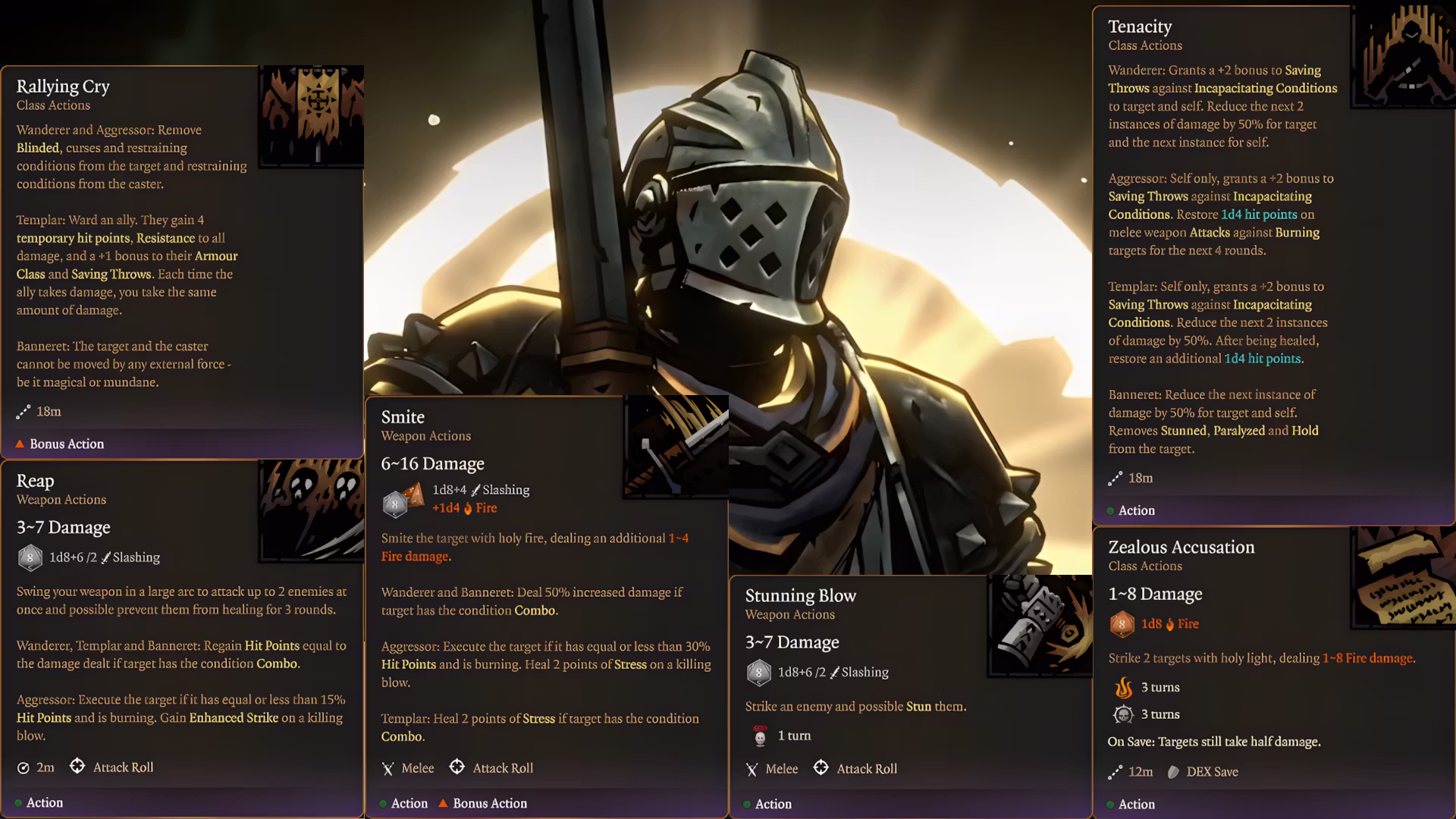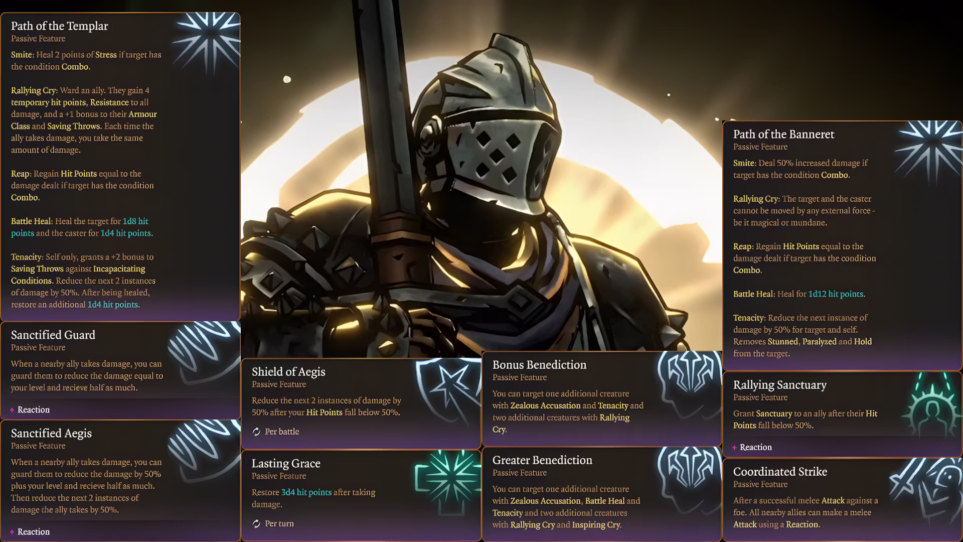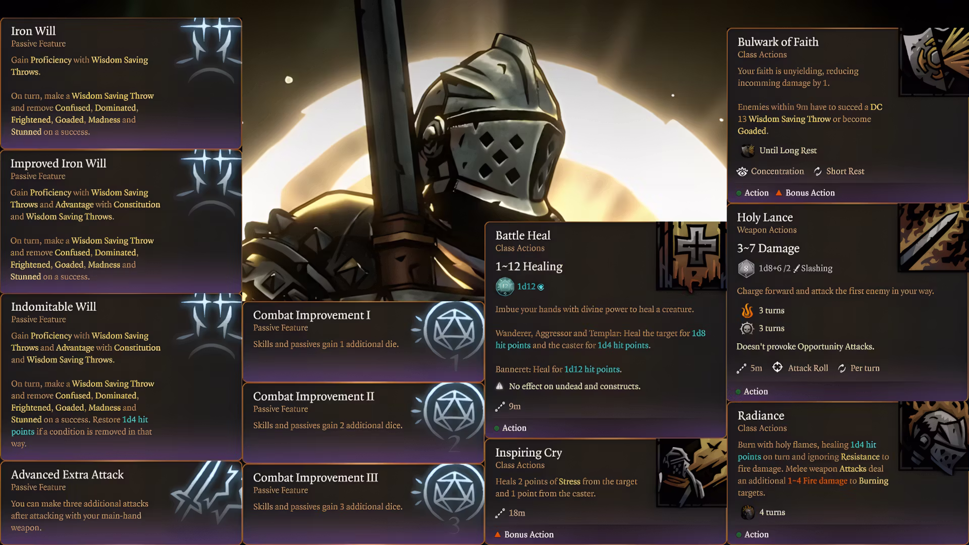- 学习3个战斗技能:战地治疗、信仰壁垒、神圣长枪、鼓舞呐喊、光辉、激励呐喊、收割、惩戒、震慑打击、坚韧不拔、虔诚谴责