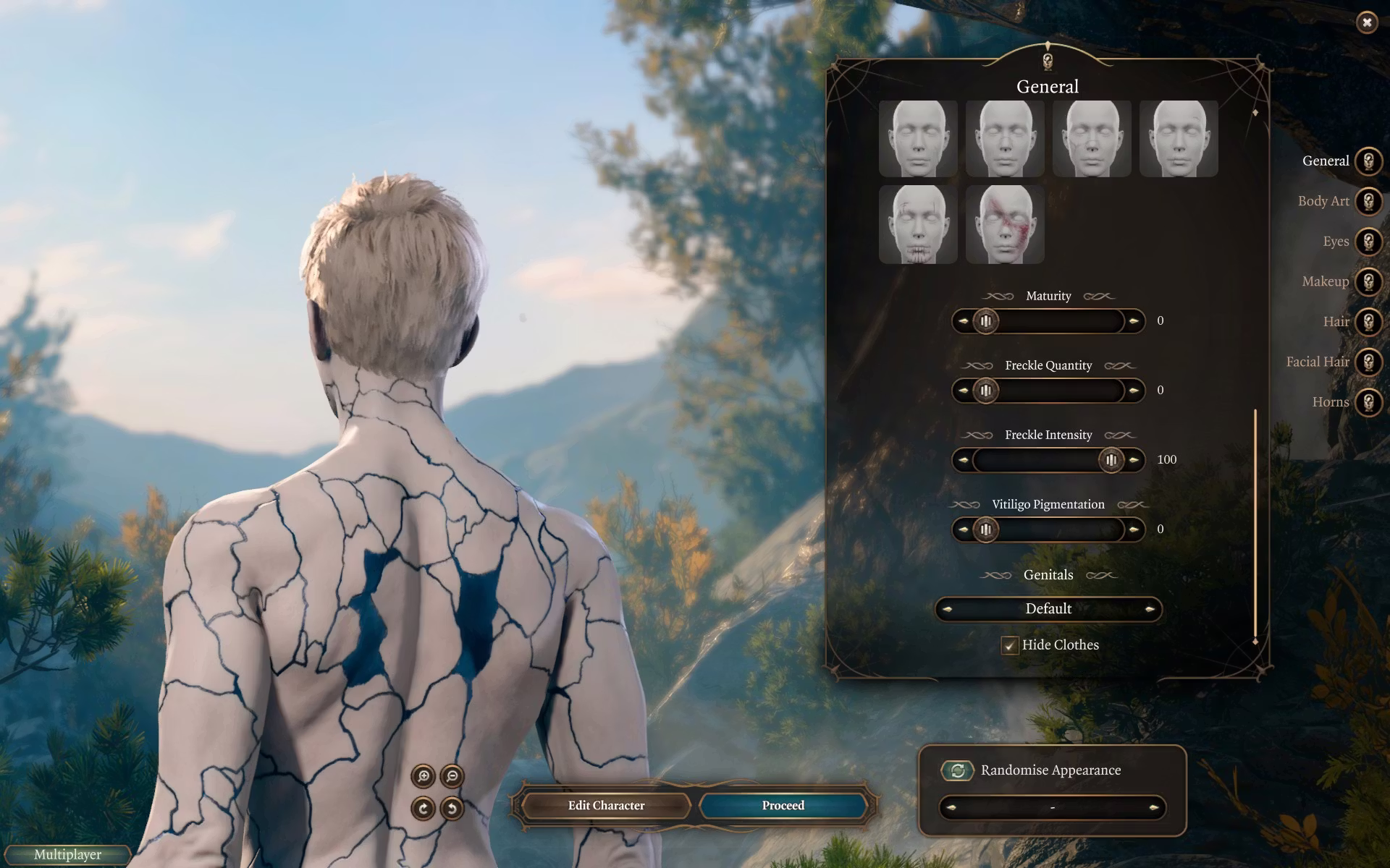 为了使用包含全身金缮纹理的完整自定义外观,艾琳现在可以作为起源角色进行选择。她的种族、职业和外貌都是可定制的(尽管体型不可更改,并且种族选择仅限于添加了自定义头部的角色),但她无论选择什么都会在对话中带有“阿西玛”和“塞勒恩圣骑士”的标签(请注意,“阿西玛”标签不会增加任何新内容,而是使用游戏中已有的标准“罕见种族”对话)。她没有其他特殊属性,并且机制上会具有你所选种族的统计数据和能力。此起源角色也与上述自定义阿西玛种族兼容。