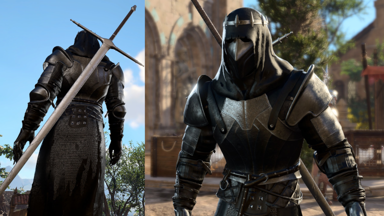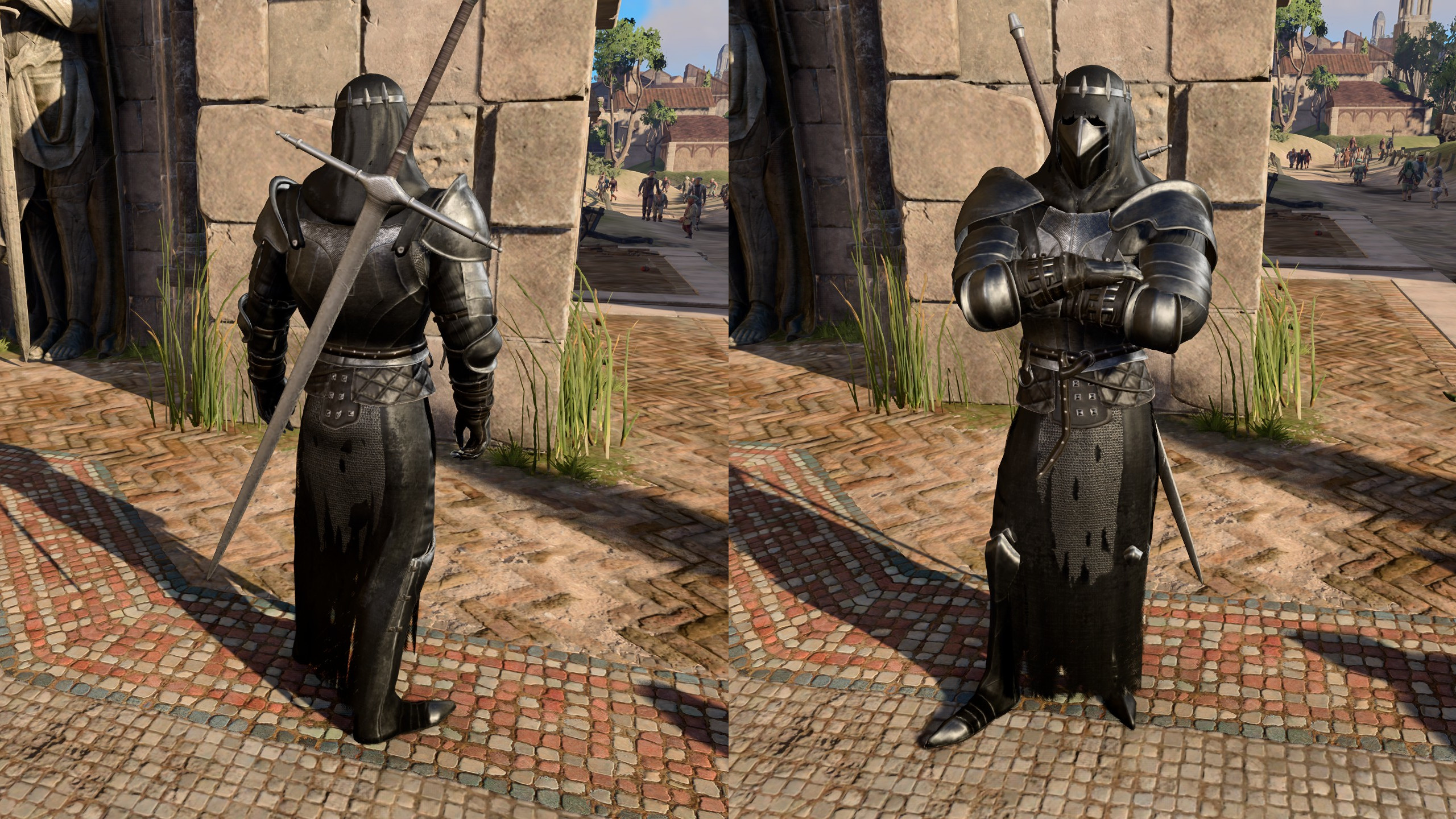 一套暗夜骑士盔甲 + 长剑出现在护甲和营地服装槽位中仅适用于体型2、4以及男性吉斯扬基种族