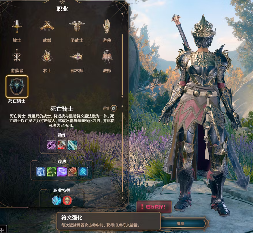 添加了一个来自《魔兽世界》的职业——死亡骑士(DK),以及3个子职——邪恶专精、冰霜专精和鲜血专精。这是一个包含原作图标、技能效果更接近BG3、符文种类更多的小型DK模组,如果想要体验更加完善且大型的DK职业,请参考我汉化过的该mod(此模组无法单独在官方管理器中使用)。