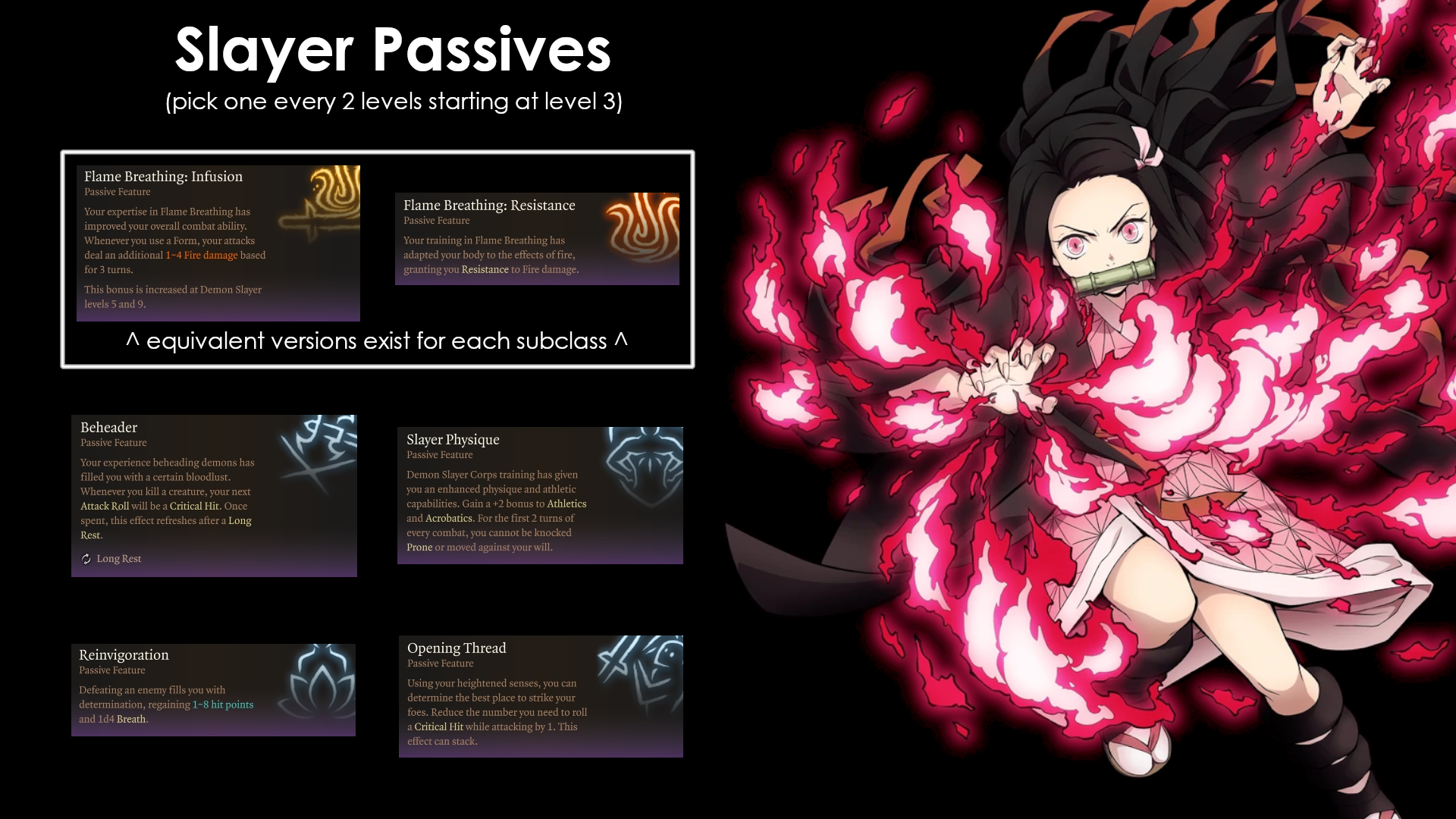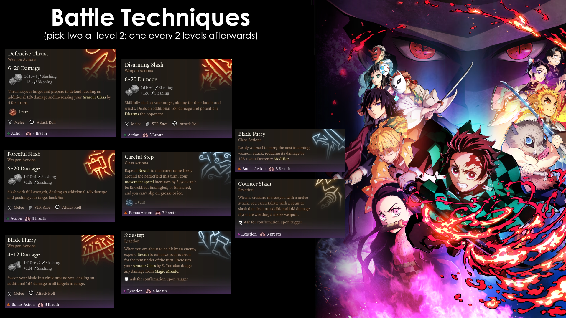 鬼杀队在鬼杀队组织中占据首要位置,该组织的唯一目标是消灭恶鬼。这些战士们肩负着猎杀和消灭恶鬼的崇高使命。鬼杀队员们练习一种名为“全集中呼吸法”的神秘呼吸技巧,通过最大限度地扩展肺部容量来吸入尽可能多的空气,加速血液循环,提高体温,并增强身体能力以应对战斗。大多数队员专注于特定的呼吸流派,其中绝大多数模仿自然界的某个方面,如火焰、水、雷电或雾气。也有一些基于不太传统的元素(例如花朵)甚至抽象概念(例如爱情)的呼吸流派。