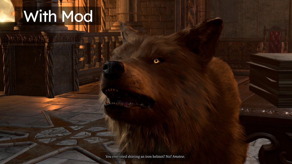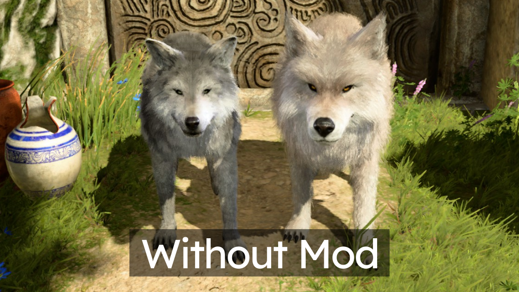 此模组更改了狂狼的外观,例如玩家德鲁伊变身时的形象,通过将基础资源更改为使用普通狼模型来实现,同时保留任何具有独特颜色的 NPC 的特性。