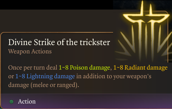 现在,诡计领域的神圣一击(牧师等级8)更加符合诡计多端的特点或适应性,提供毒液、辐射或闪电三种选择。灵感来源于自然领域的神圣一击,但与其他领域有所不同。