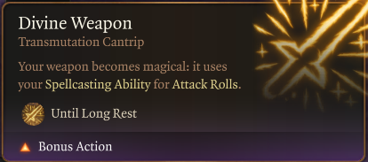 我想要让牧师在近战战斗中更具有能力,因此制作了这个一级法术。它的功能类似于德鲁伊的《锡莱拉格》(Shillelagh),但没有限制任何类型的近战武器,并且武器保留其原有的伤害骰。