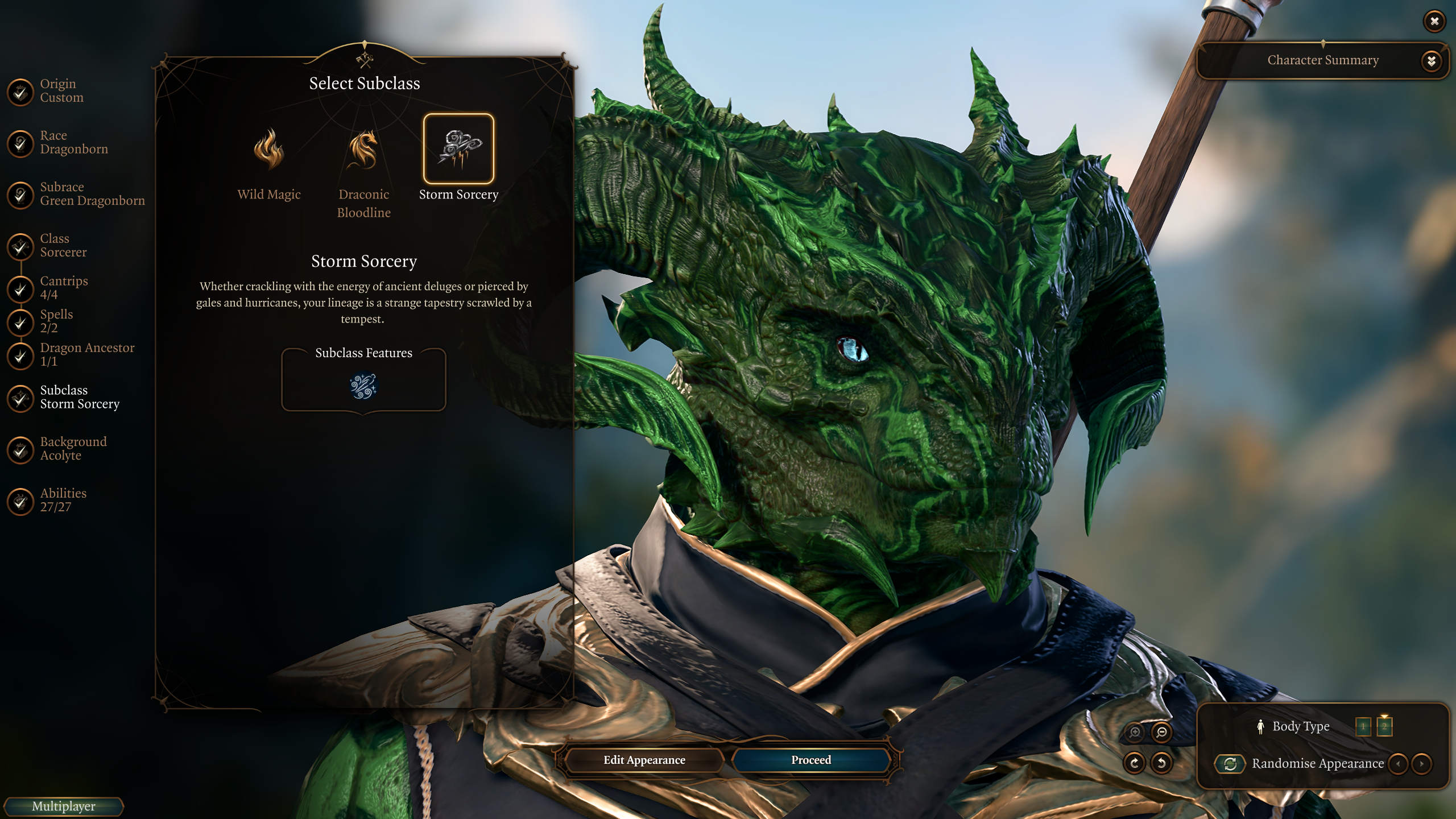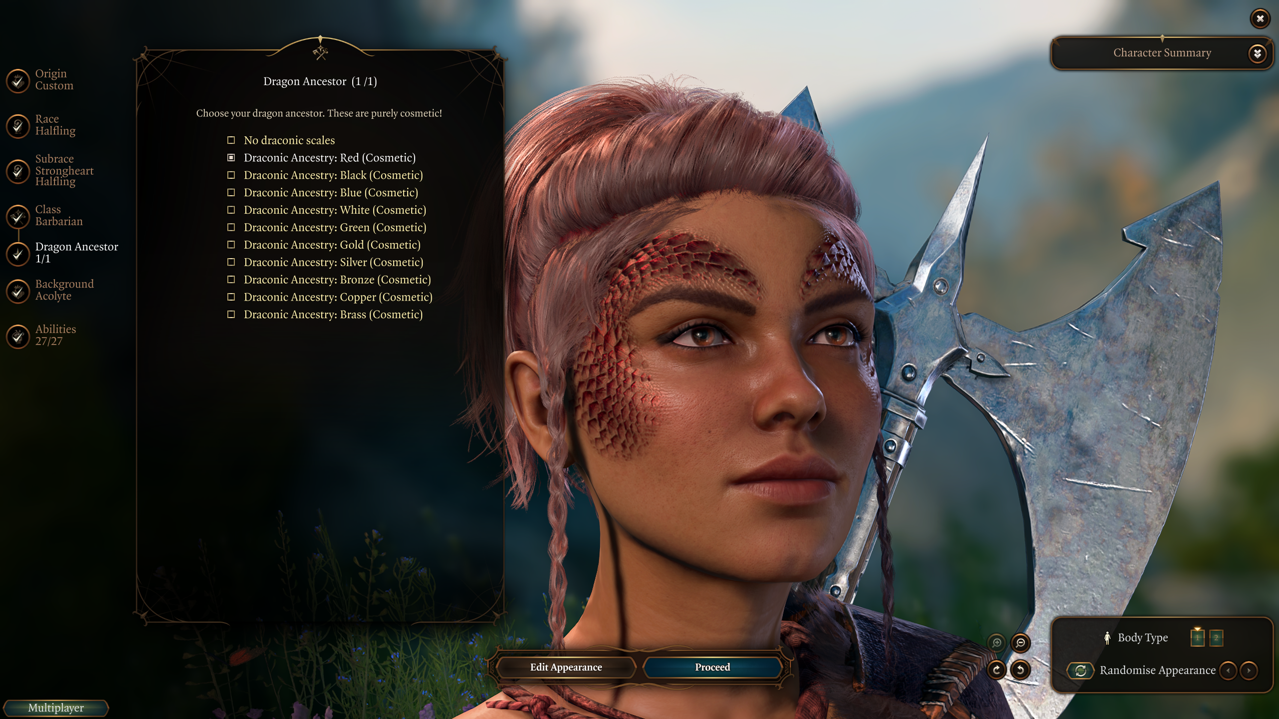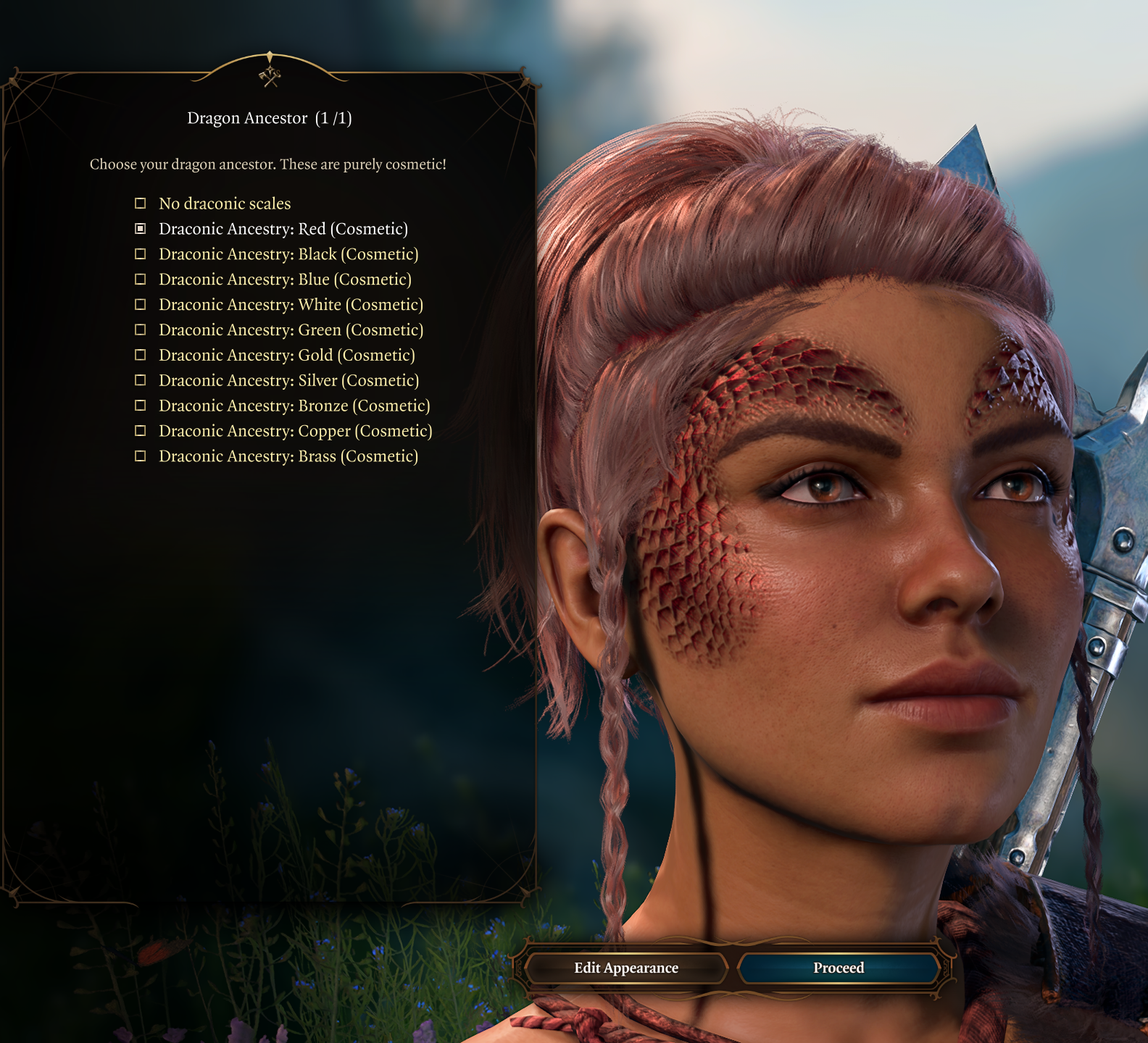 – 在创建角色界面中,你只能选择非常基础的选项,这是 UI 的限制,我目前无法绕过。为了进行详细自定义,请必须使用营地内的魔法镜。建议选择龙术士职业以便在创建角色界面中访问编辑器,选择你喜欢的预设并记住它们,然后在魔法镜中应用。