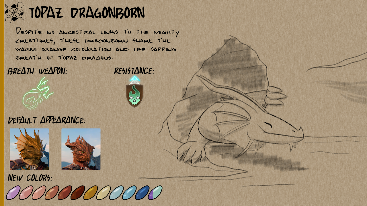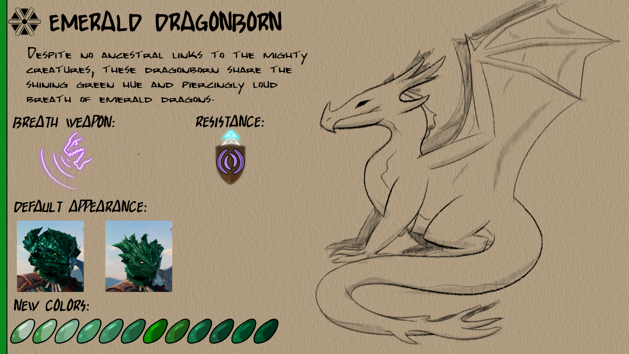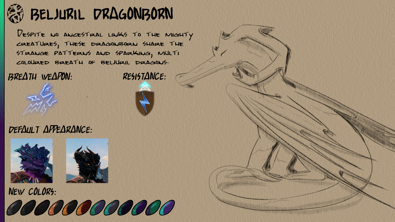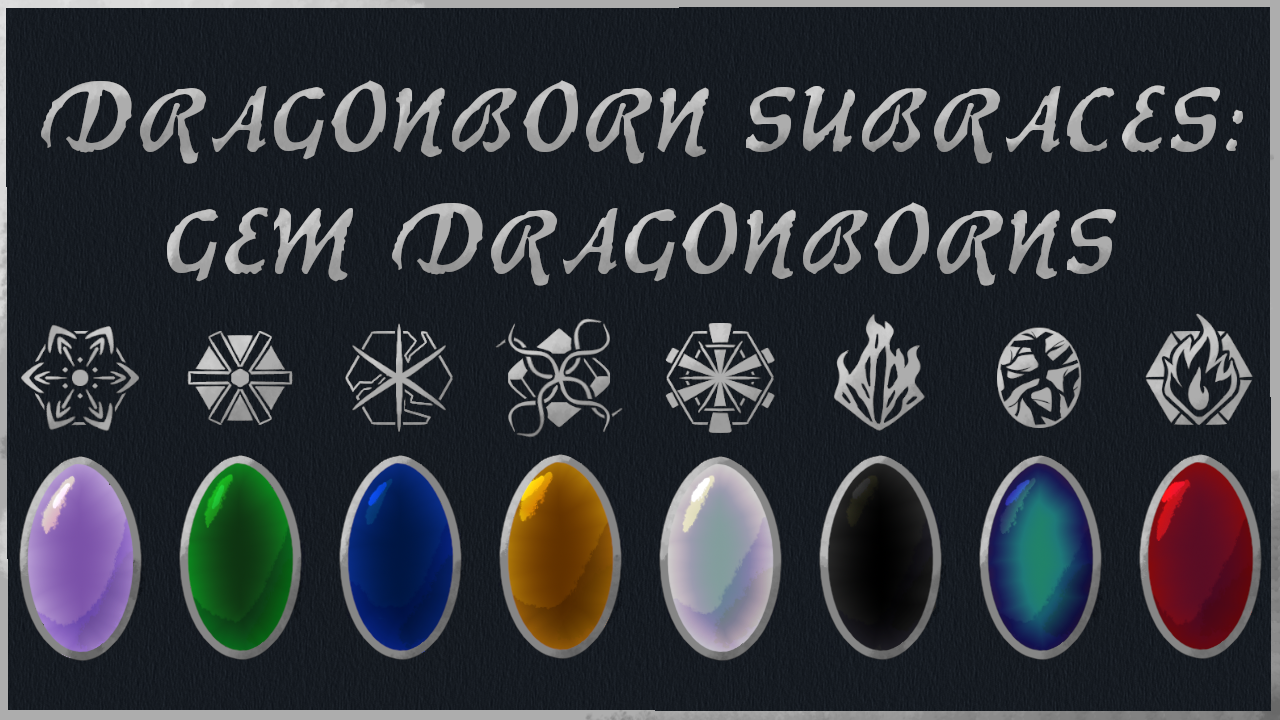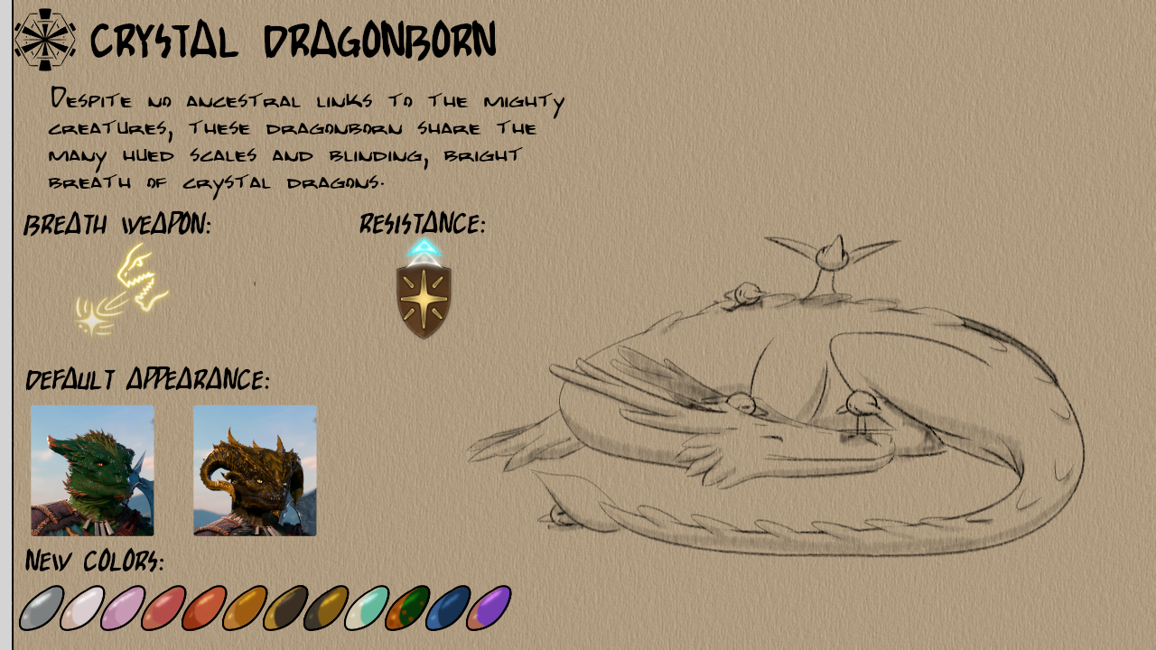 此模组添加了八种新的龙裔次种族:紫水晶、祖母绿、蓝宝石、黄玉、水晶、黑曜石、贝尔朱里尔和红宝石。每个次种族都有12种新皮肤颜色以及独特的视觉效果(VFX)用于他们的吐息武器。
