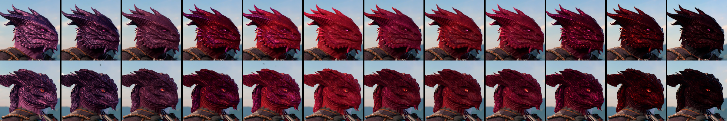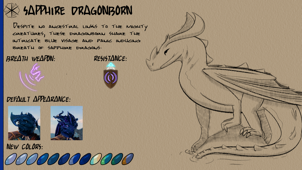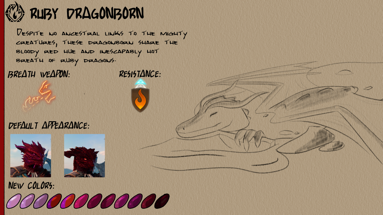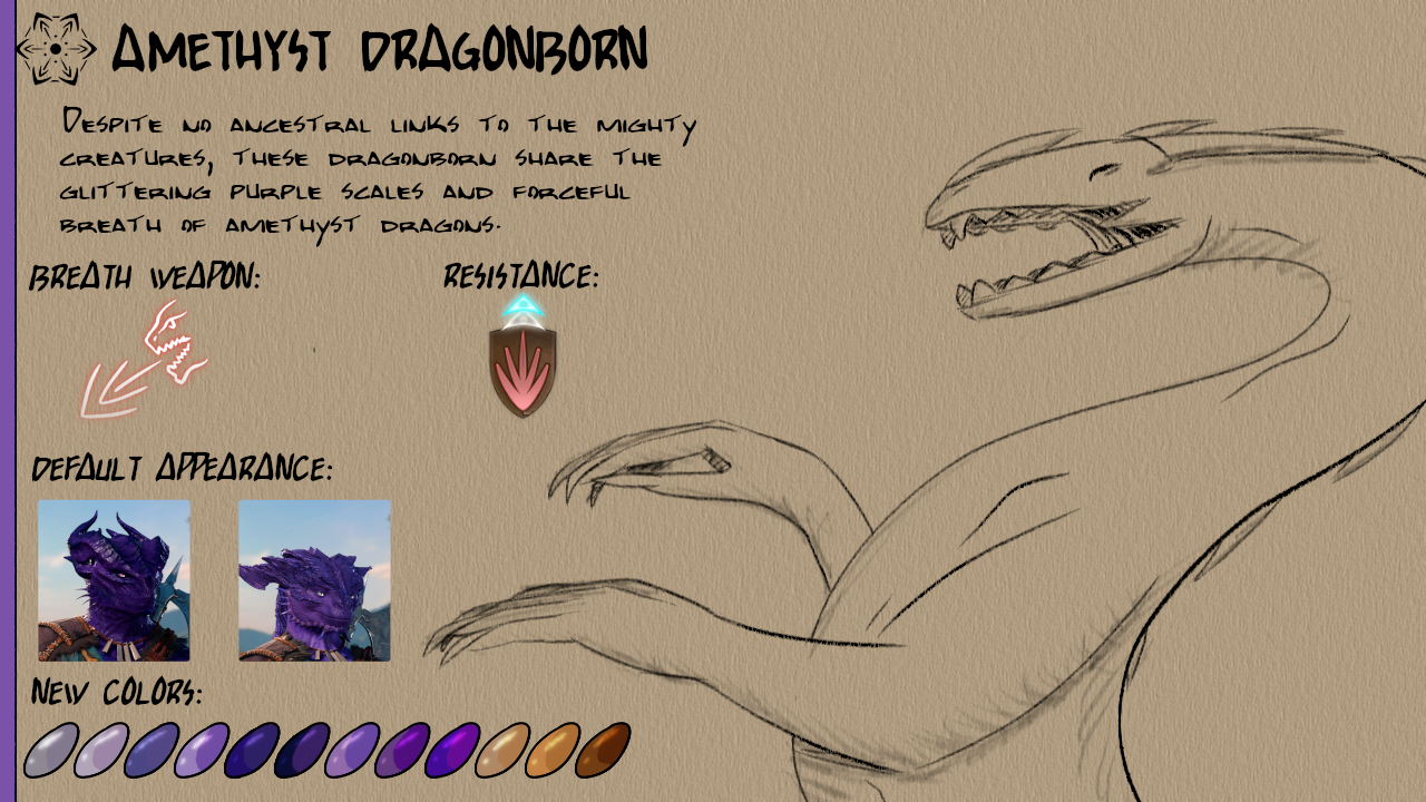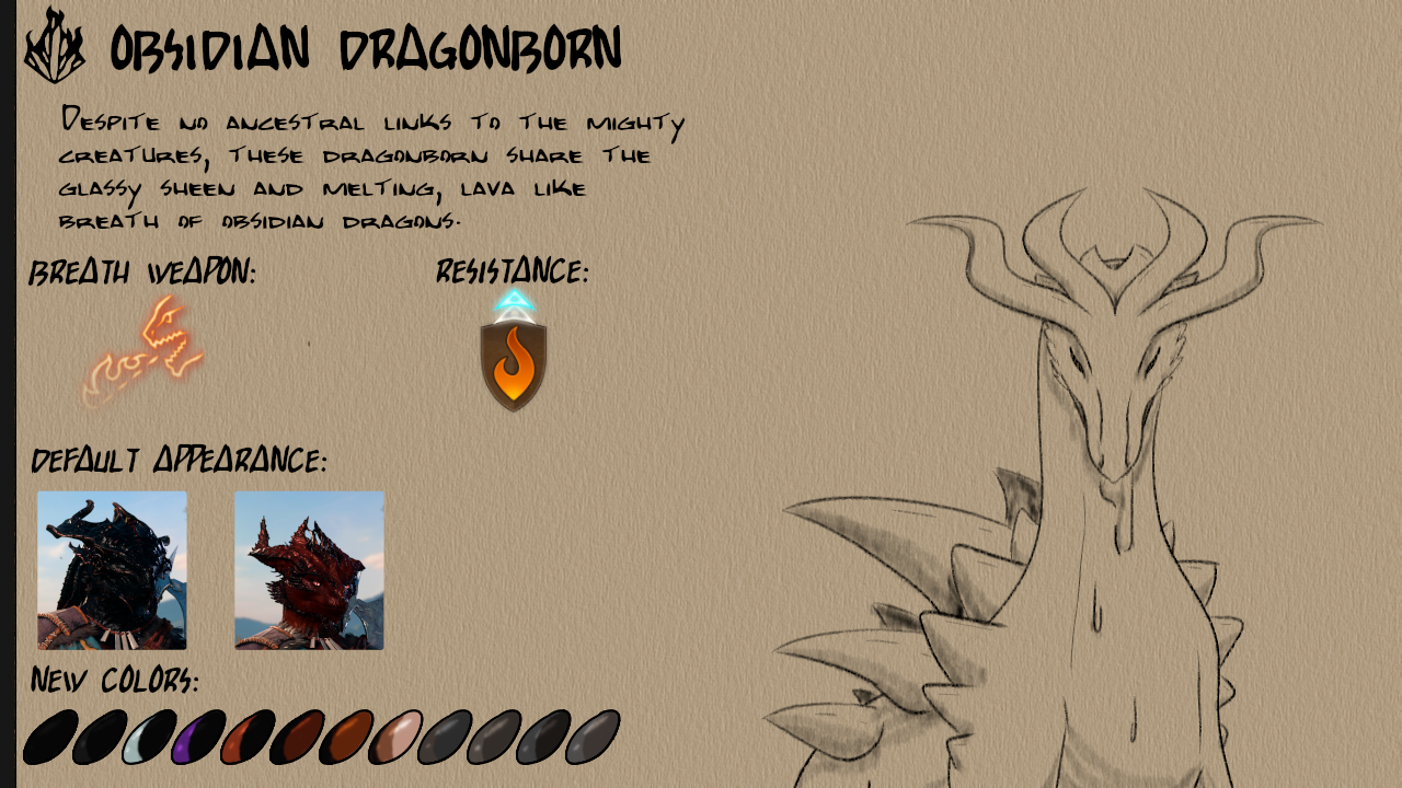 此模组添加了八种新的龙裔次种族:紫水晶、祖母绿、蓝宝石、黄玉、水晶、黑曜石、贝尔朱里尔和红宝石。每个次种族都有12种新皮肤颜色以及独特的视觉效果(VFX)用于他们的吐息武器。