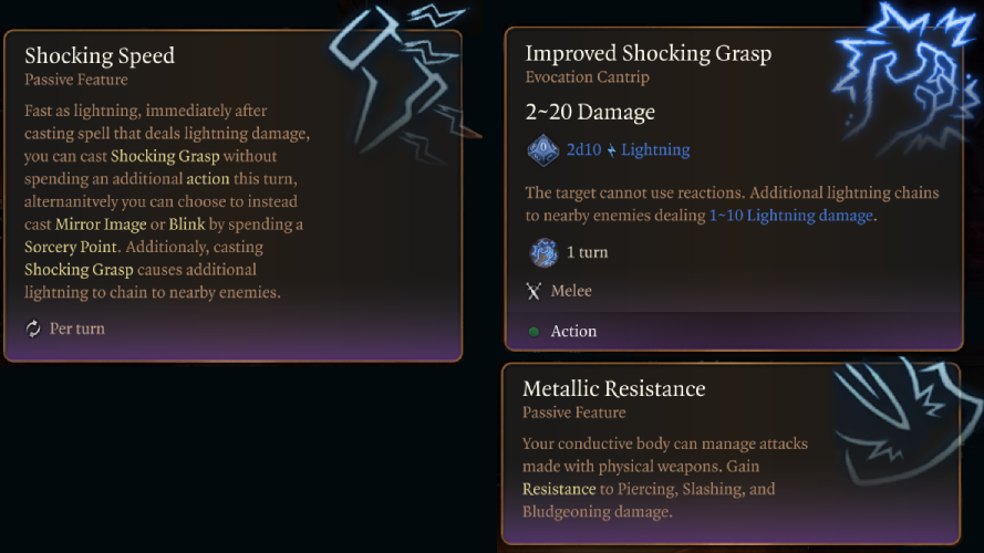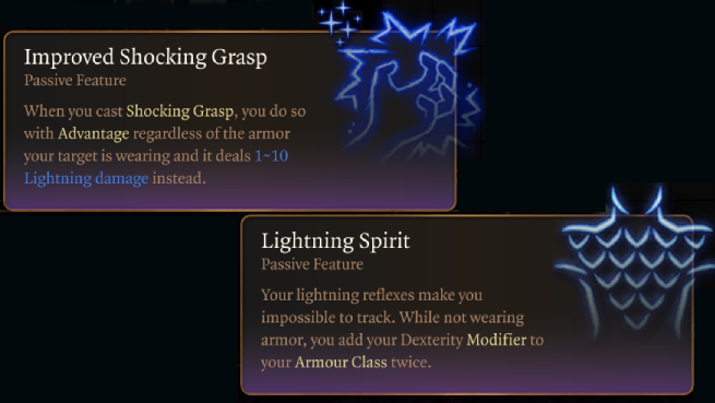 改进的惊雷触击 – 惊雷触击获得无条件优势和增强的伤害骰。*注:这不会改变原版的惊雷触击,而是提供一个改进的新版本,因此建议在选择法术时避免学习惊雷触击以避免热键栏中的混淆。