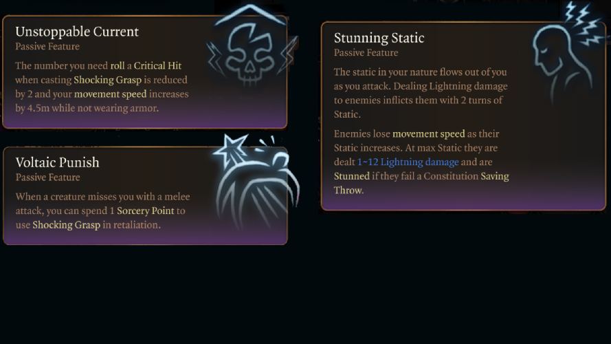 静电眩晕 – 使用闪电法术后对敌人施加一个叠加的负面效果,减少他们的移动速度并在最大层数时可能使他们昏迷。