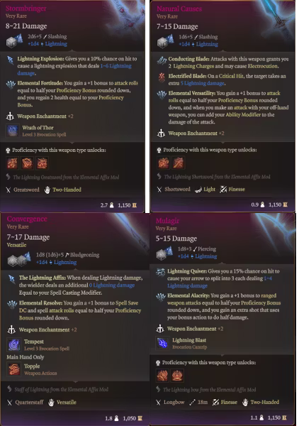 每种元素都有一个物品系列,效果大致相同。我已经上传了闪电版本的每个物品的照片。但模组为每种元素添加了一个完整的物品集合。