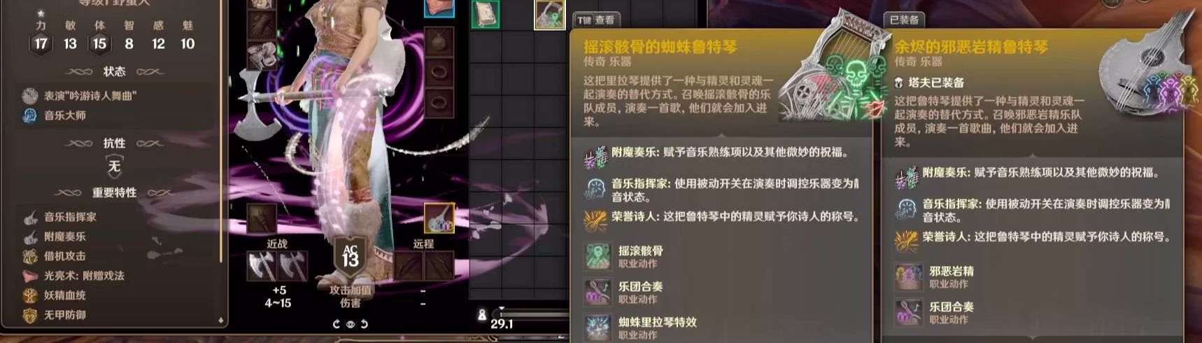 新被动还可以随时决定奏乐时哪个声部静音,甚至有一把会在演出时根据节奏自动吹口哨的鲁特琴(口哨声也可以静音)!你还可以通过新法术的效果强迫其他单位与你共同演奏或跳舞!在演奏中出现的顽皮的音乐之灵可能会给在场的随机角色涂上“小丑”的脸部彩绘!另外还整合了作者的无伤害友好“恶毒嘲笑”模组,以及能在迫不得已的战斗祈求混沌帮助你的“混沌蛊惑”新法术。