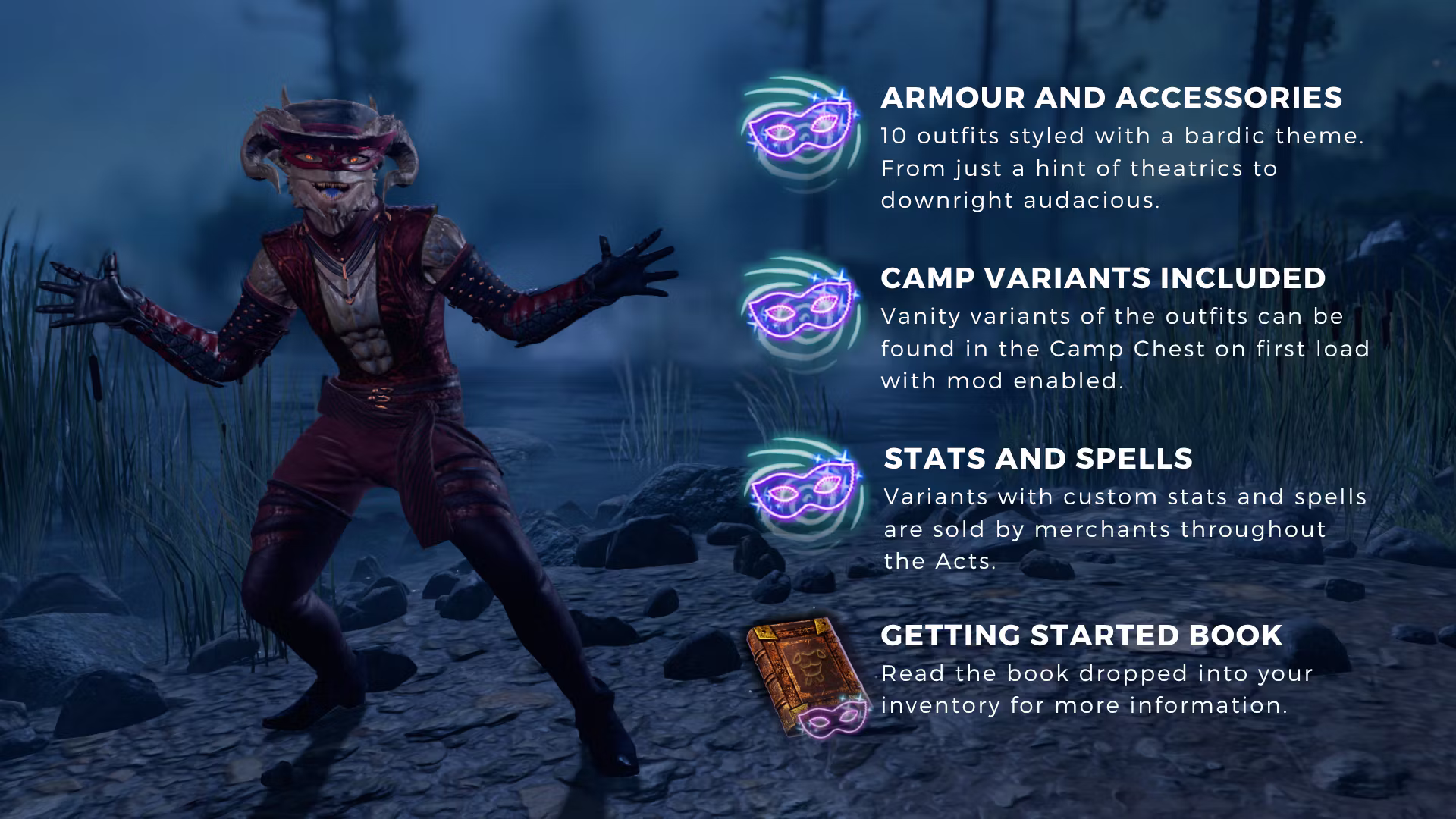 - 由于此模组添加了自定义服装、法术和状态,因此无法在游戏中途移除该模组,除非先执行一些预设的游戏内步骤来完全删除定制物品。对于PC玩家而言,Nexus上有可用的脚本扩展器模组可以清除保存战役中的自定义模组物品:Mod Uninstaller