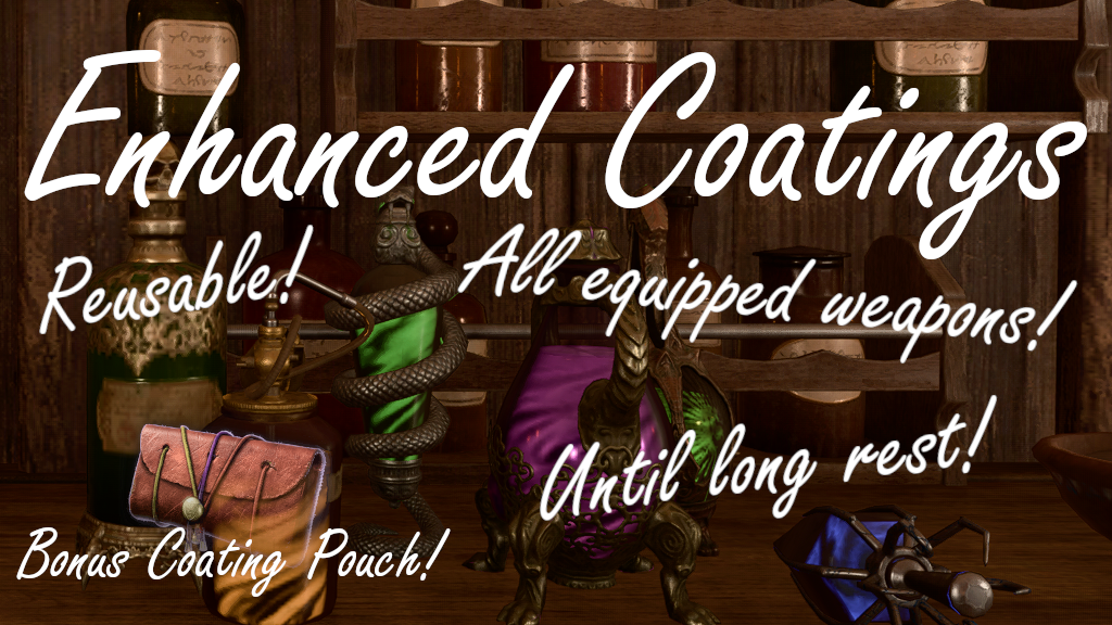 当你使用一个涂层时,它会同时涂覆你的近战武器和远程武器。涂层将持续到你下一次长时间休息,并且在使用后不会被消耗掉。如果你希望在长时间休息前移除涂层,可以使用提供的清洁布来擦拭武器。我还包括了一个袋子,用于存放所有涂层(以及清洁布)。