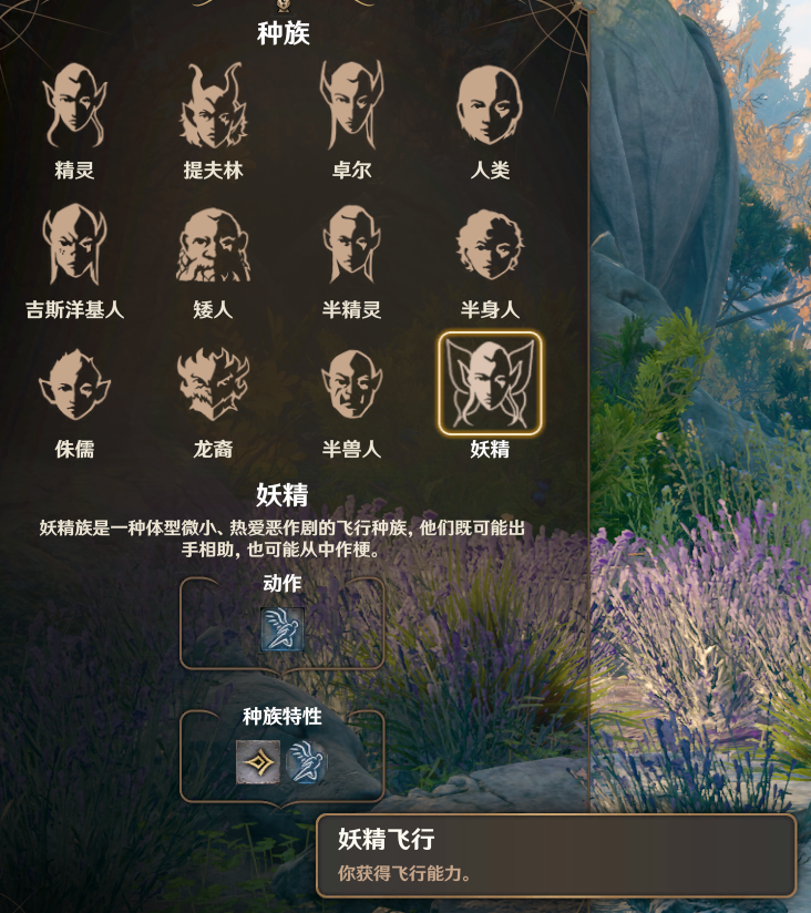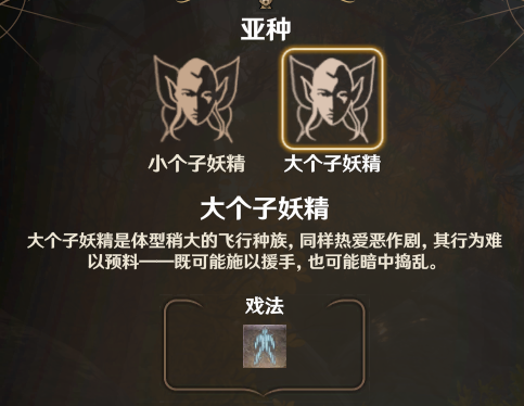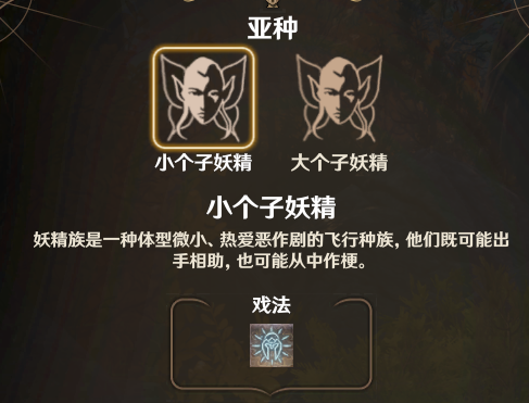 妖精种族的中文翻译。添加1个种族——妖精族,以及2个子种族——大个子妖精(精灵和提夫林)和小个子妖精(侏儒和半身人)。妖精天生拥有飞行能力,可在被动启闭飞行。可以不消耗资源使用光亮术、妖火,以及拥有缩小为微型体型的能力。