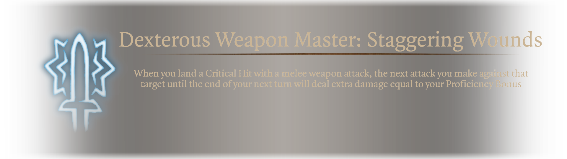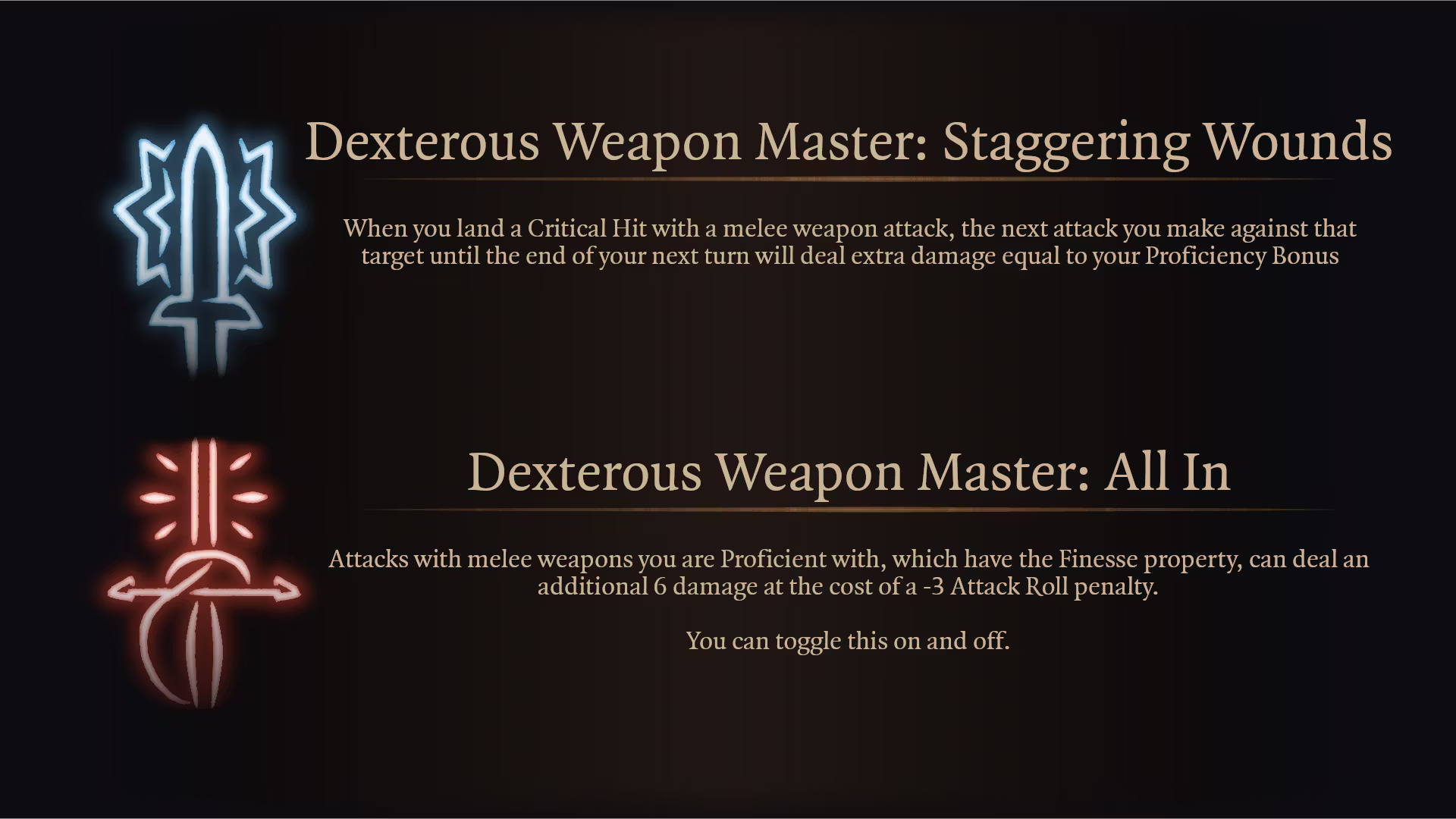 灵巧武器大师(DWM)是一个赋予你可切换被动特性的特性。在使用熟练的敏捷武器时,你的攻击检定减少3点,同时伤害增加6点。此外,在用近战武器攻击敌人造成致命一击时,你会使他们蹒跚不前,从而削弱他们的防御并让你能够更猛烈地打击,额外造成的伤害等于你的精通加值。