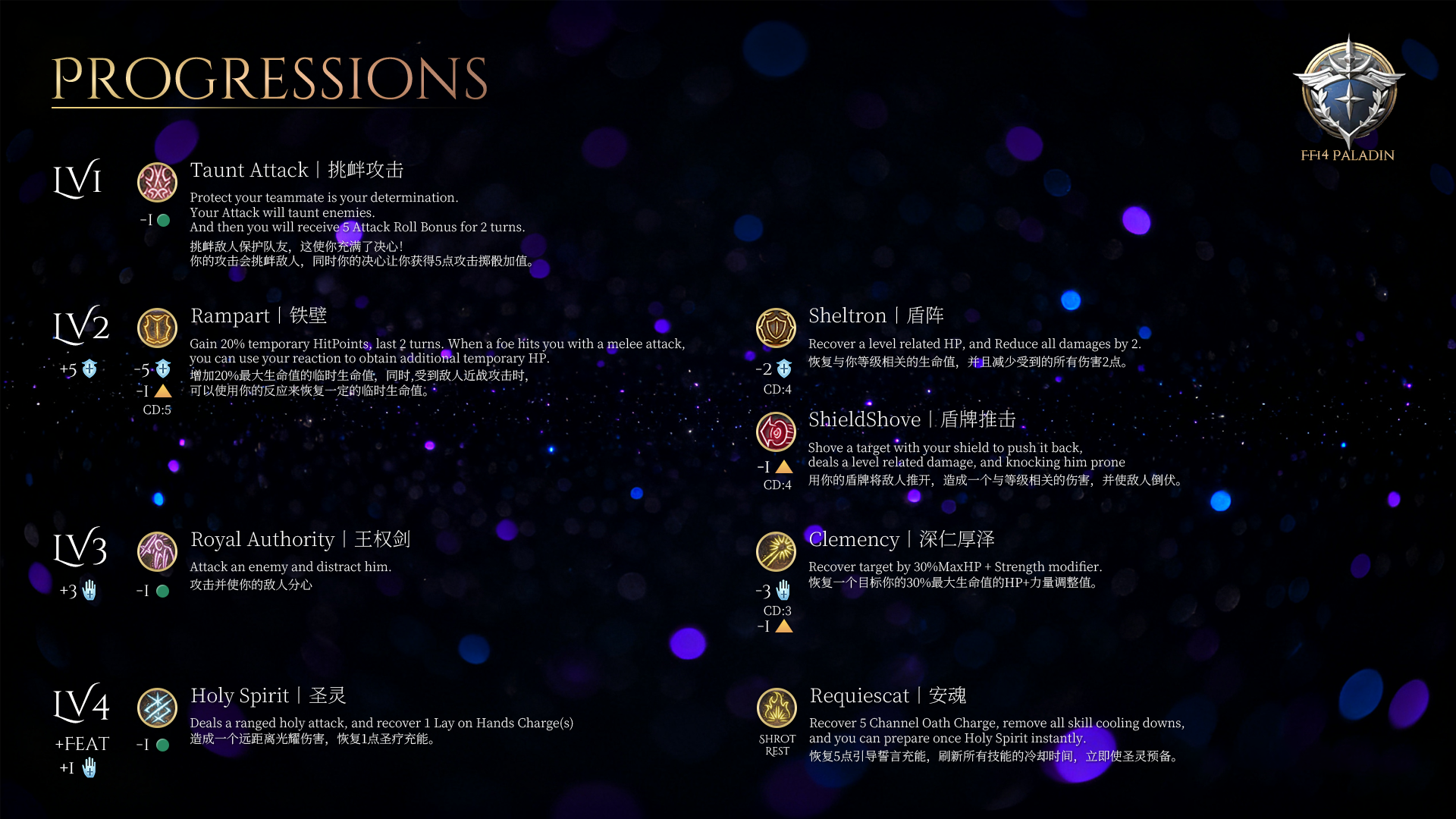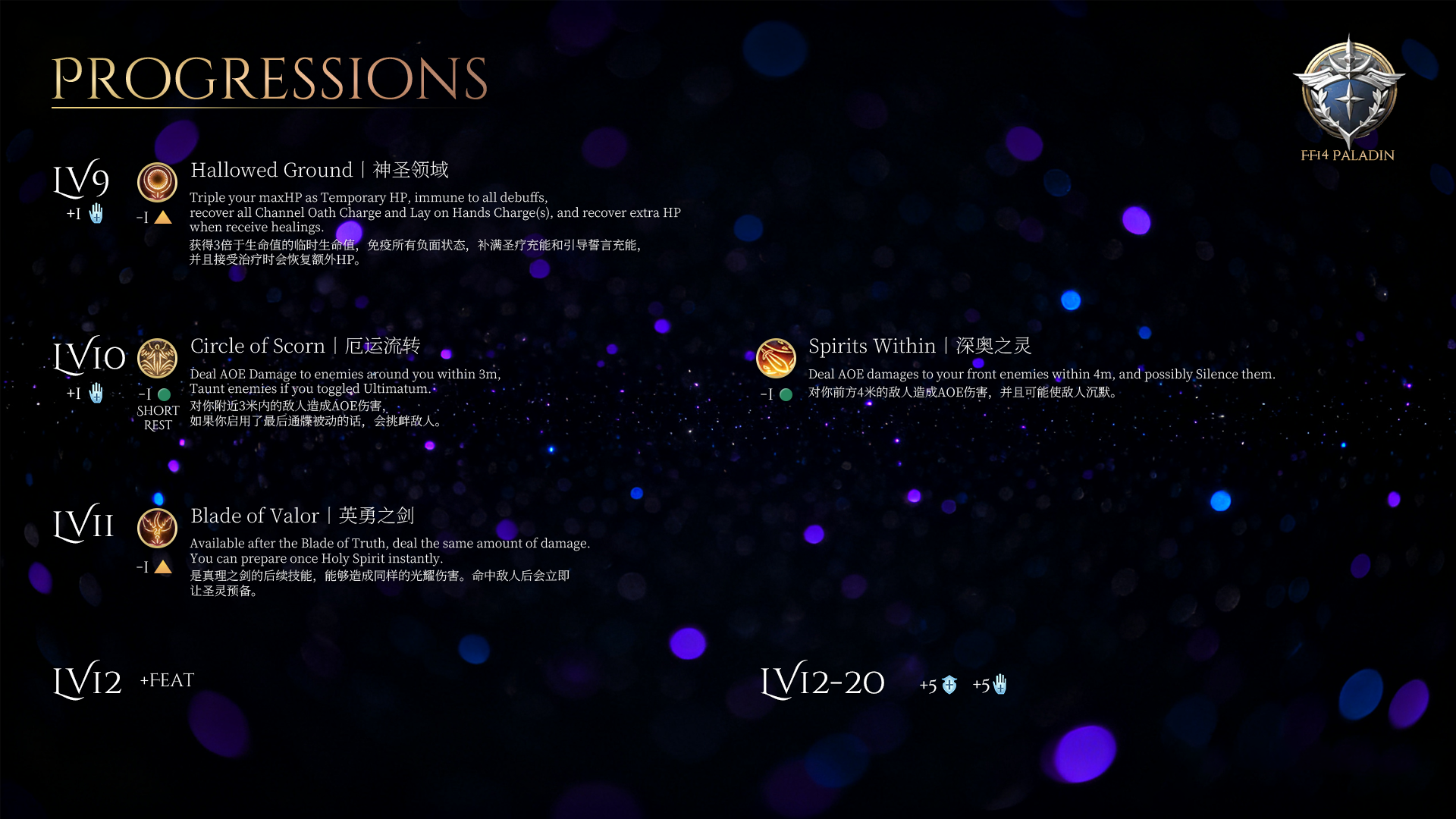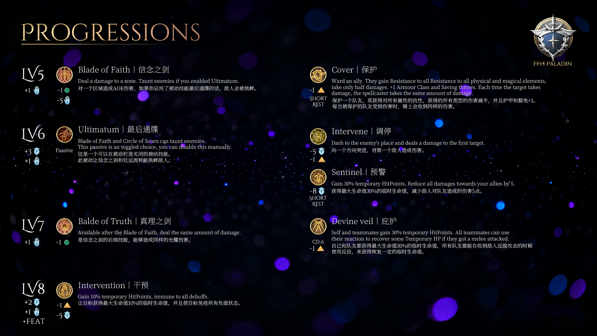 > 这个职业专注于保护队友,优先考虑防御能力而非输出伤害。它可以提供临时生命值,并进行治疗。此外,这个FF14 Paladin也是Paladin。因此,如果你做了不恰当的事情,你可能会违背你的誓言!