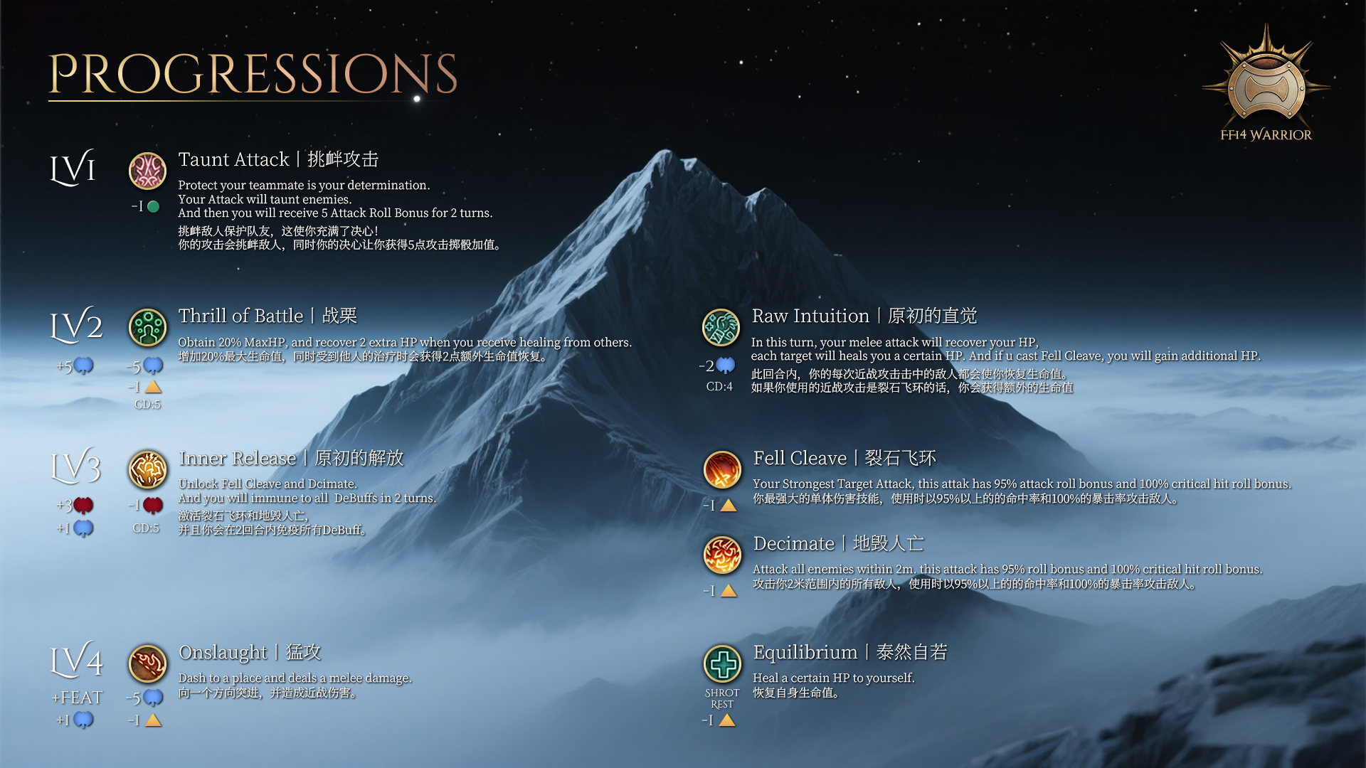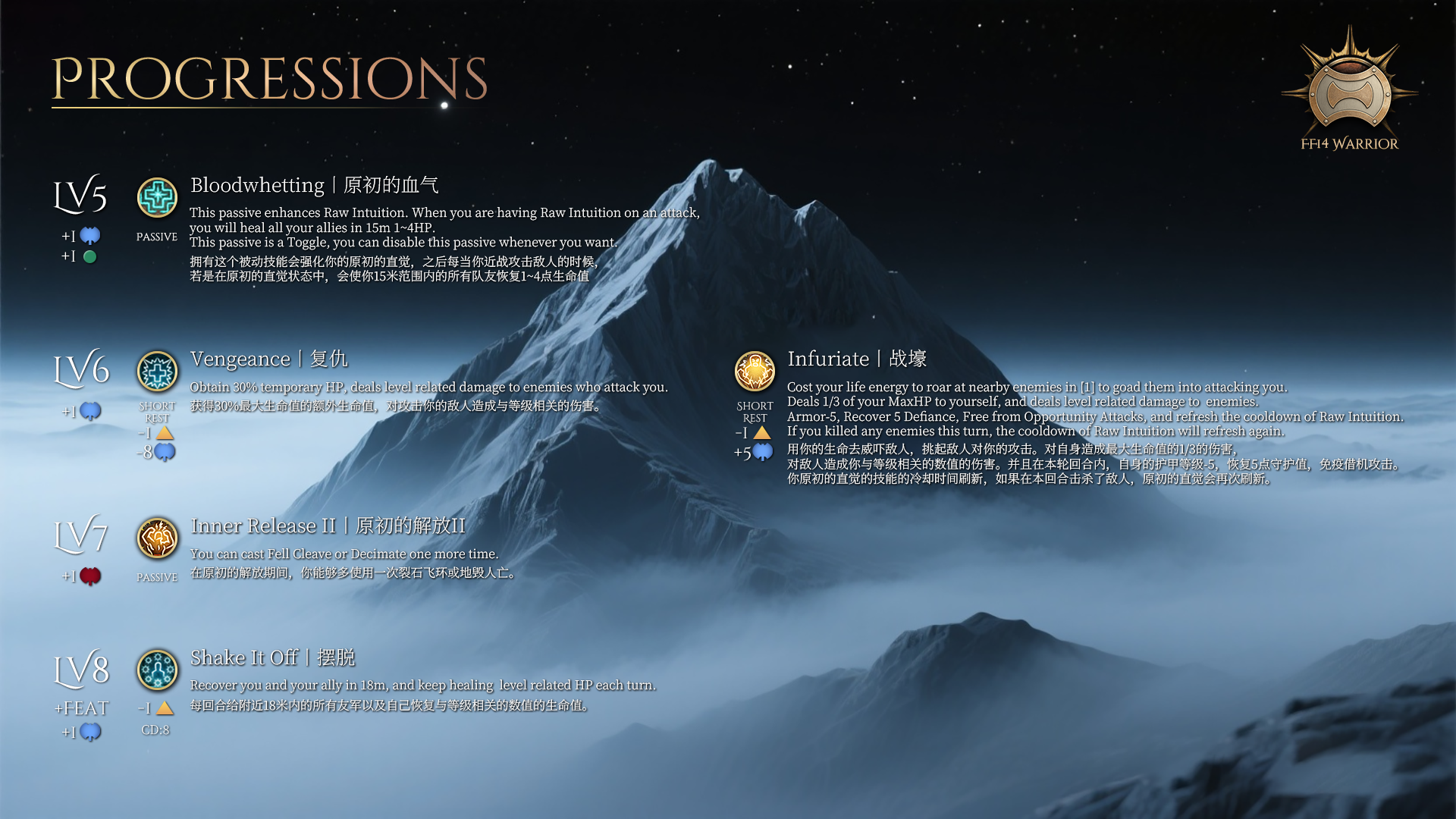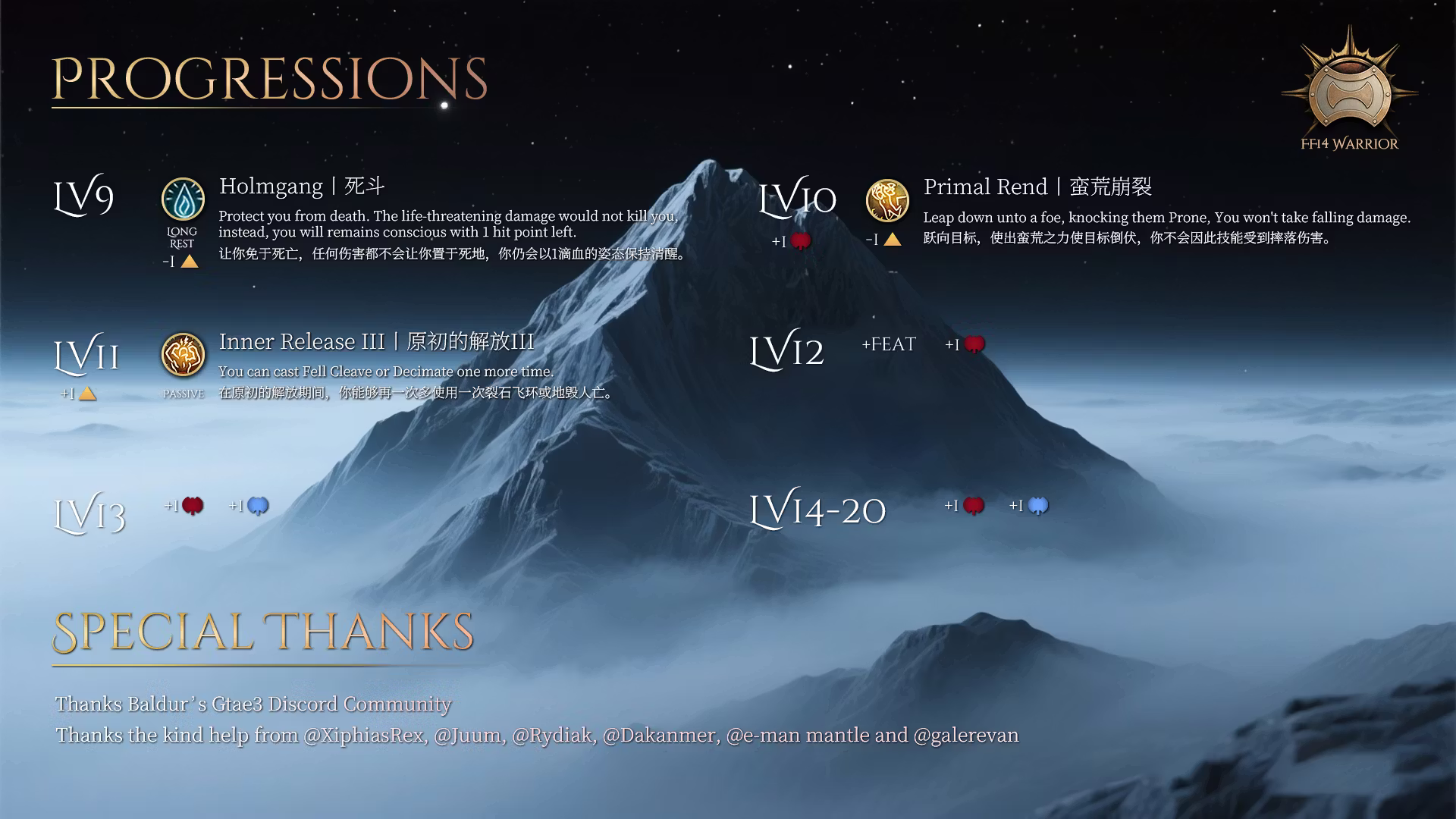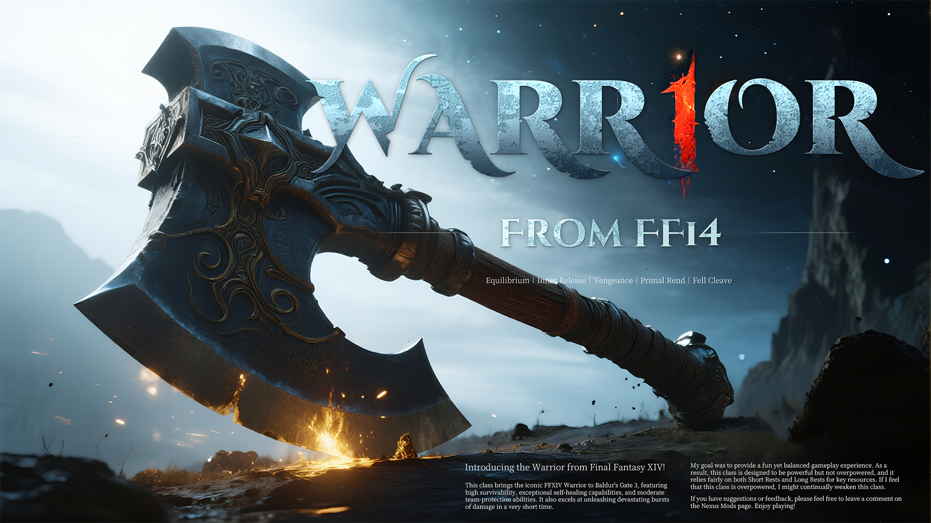 > 这个职业将 FFXIV 中的标志性战士引入 Baldur’s Gate 3,具备强大的韧性、出色的自我治疗能力和适度的团队保护能力。它还擅长短时间内释放毁灭性的伤害爆发。
