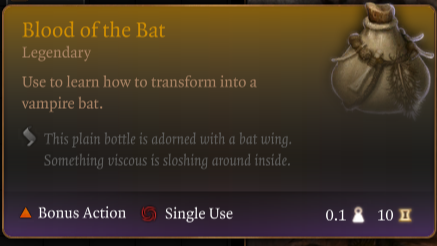 为德鲁伊的秘密宝库添加了一种药剂,饮用后可以解锁野兽变形:吸血蝙蝠。这意味着你的队伍中的任何人都可能变成一只蝙蝠,但如果你让别人喝了它,Astarion会非常伤心。