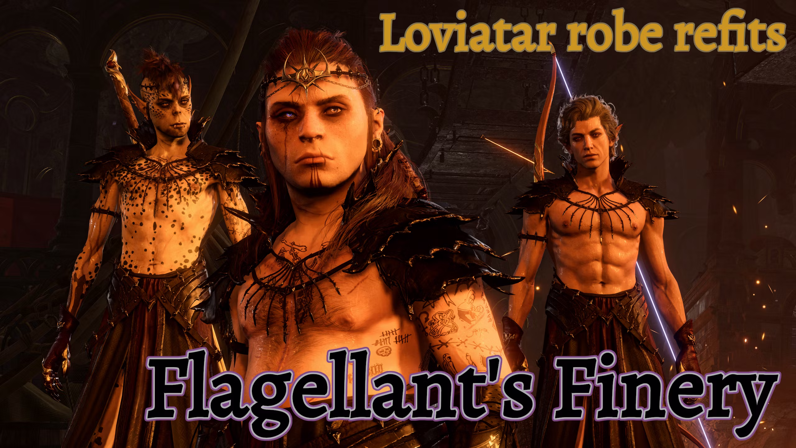 Flagellant’s Finery 将 Abdirak 和 Sorn 穿着的 Loviatar 礼服重新设计,使其适用于所有原版角色体型——高个子、矮个子、强壮型、龙形等。Loviatar 欢迎来自各种体型的人献上痛苦。