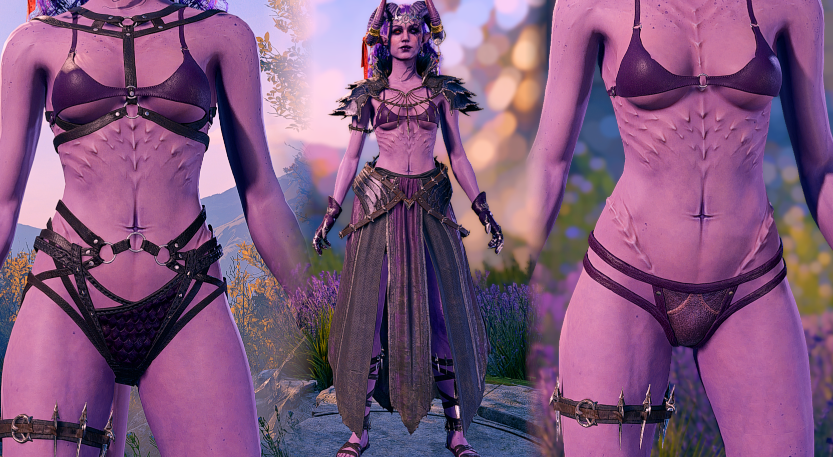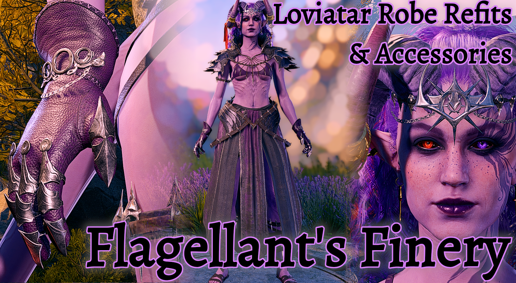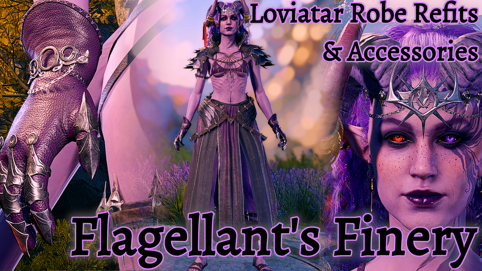 Flagellant’s Finery 将 Abdirak 和 Sorn 穿着的 Loviatar 礼服重新设计,使其适用于所有原版角色体型——高个子、矮个子、强壮型、龙形等。Loviatar 欢迎来自各种体型的人献上痛苦。