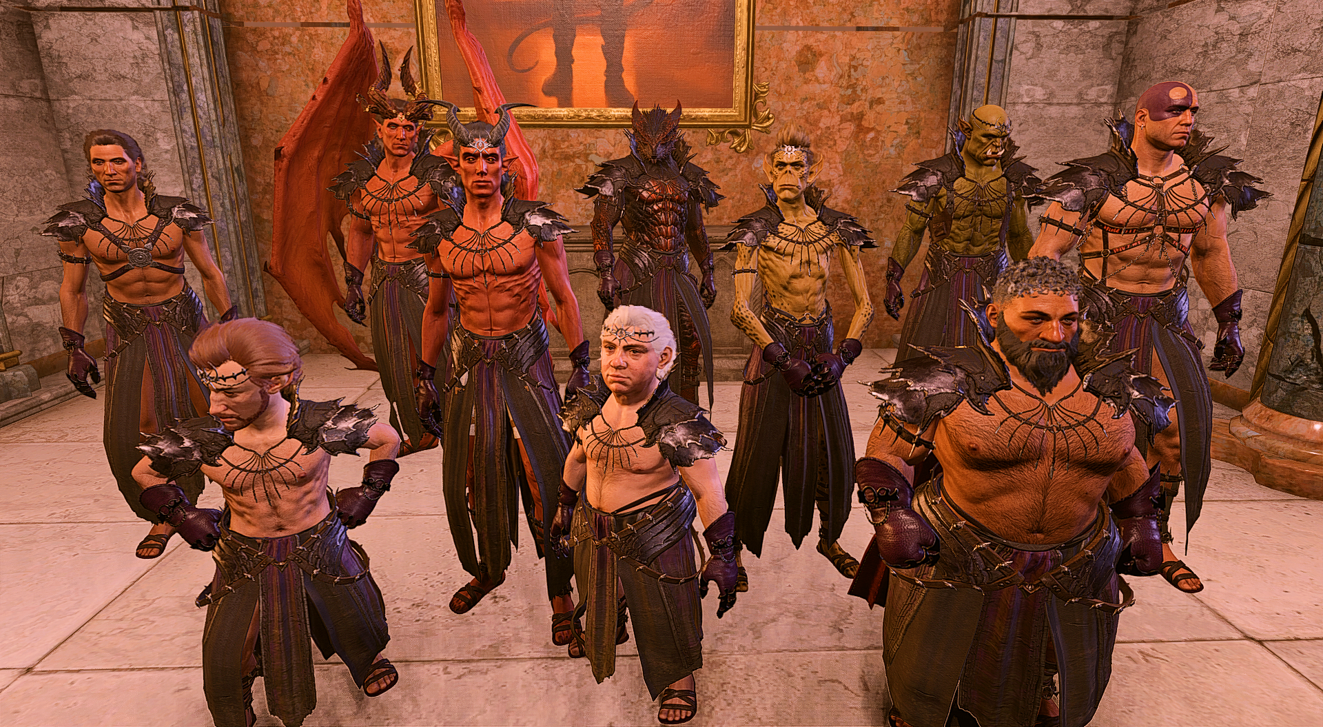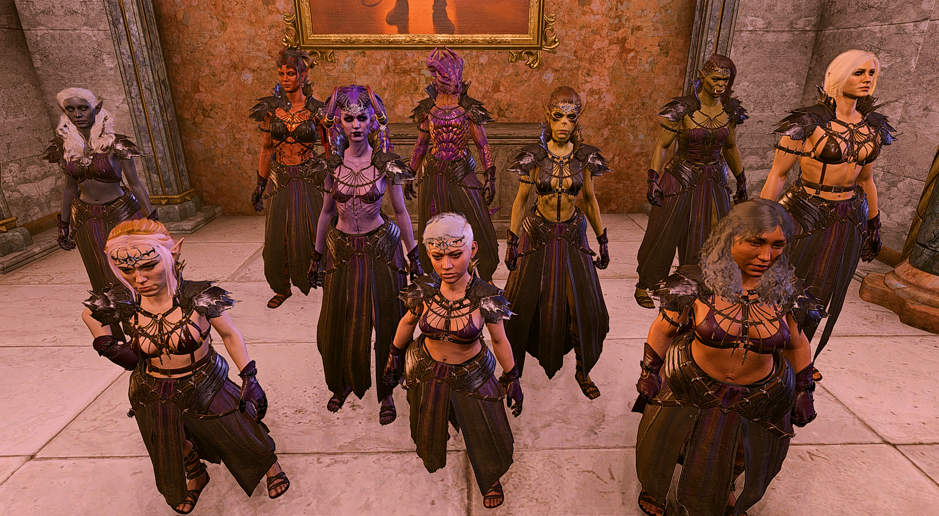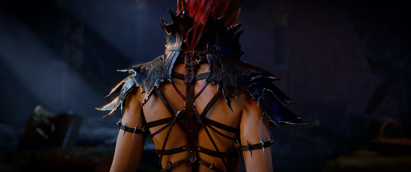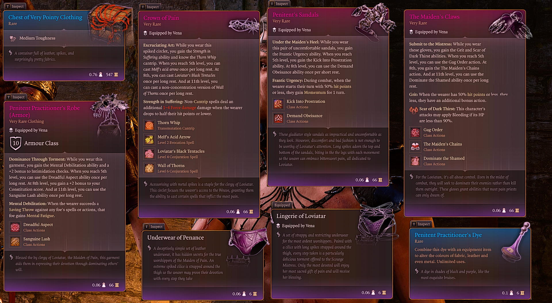 Flagellant’s Finery 将 Abdirak 和 Sorn 穿着的 Loviatar 礼服重新设计,使其适用于所有原版角色体型——高个子、矮个子、强壮型、龙形等。Loviatar 欢迎来自各种体型的人献上痛苦。