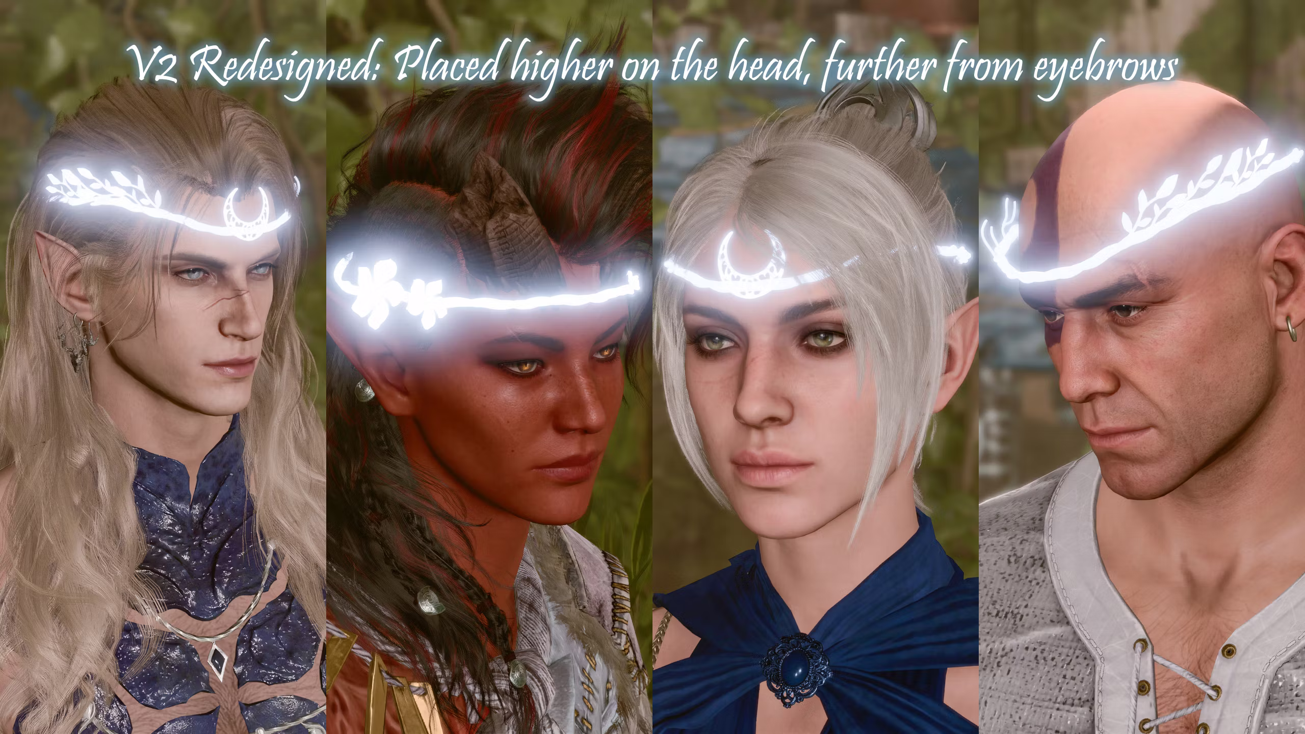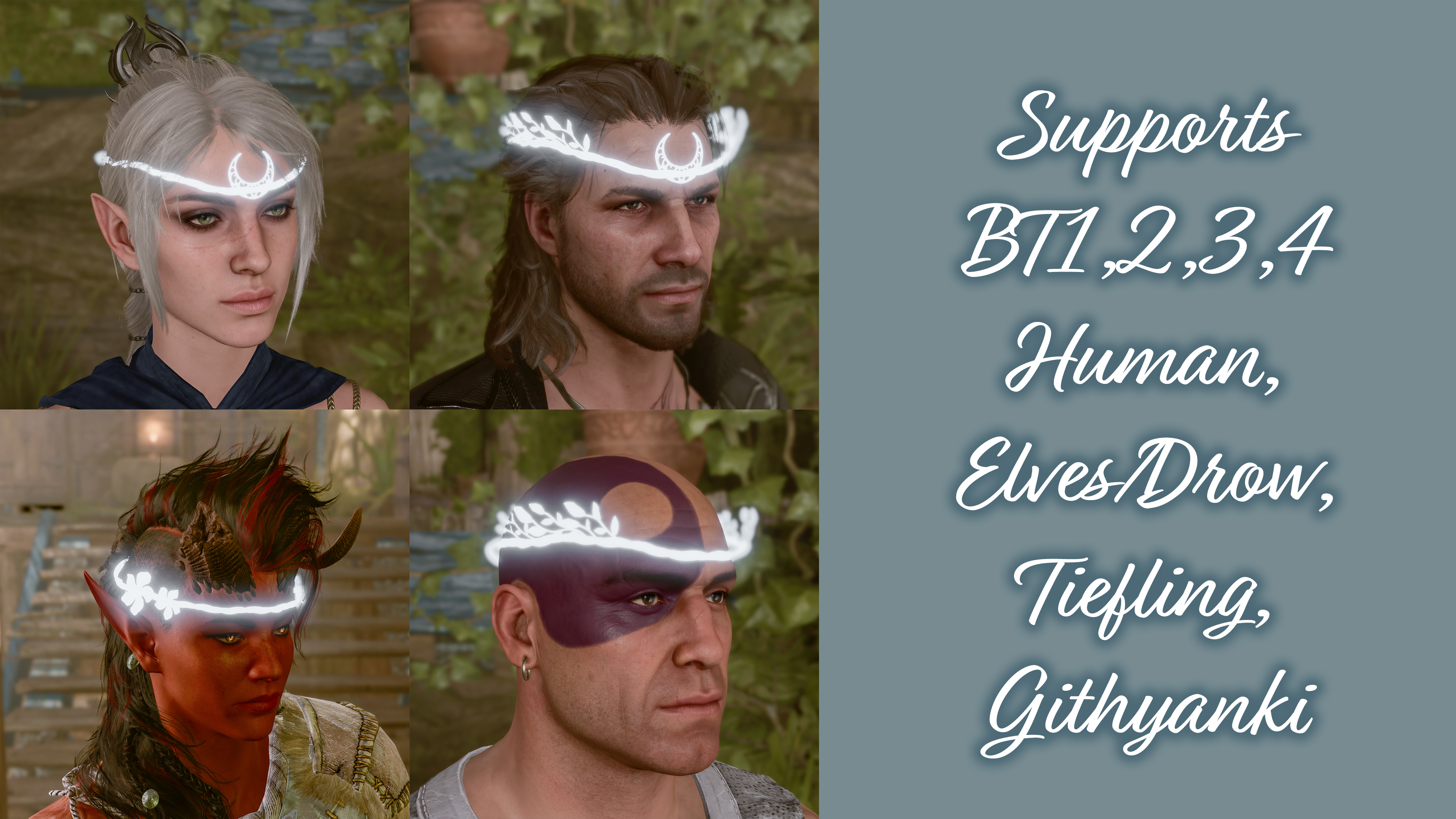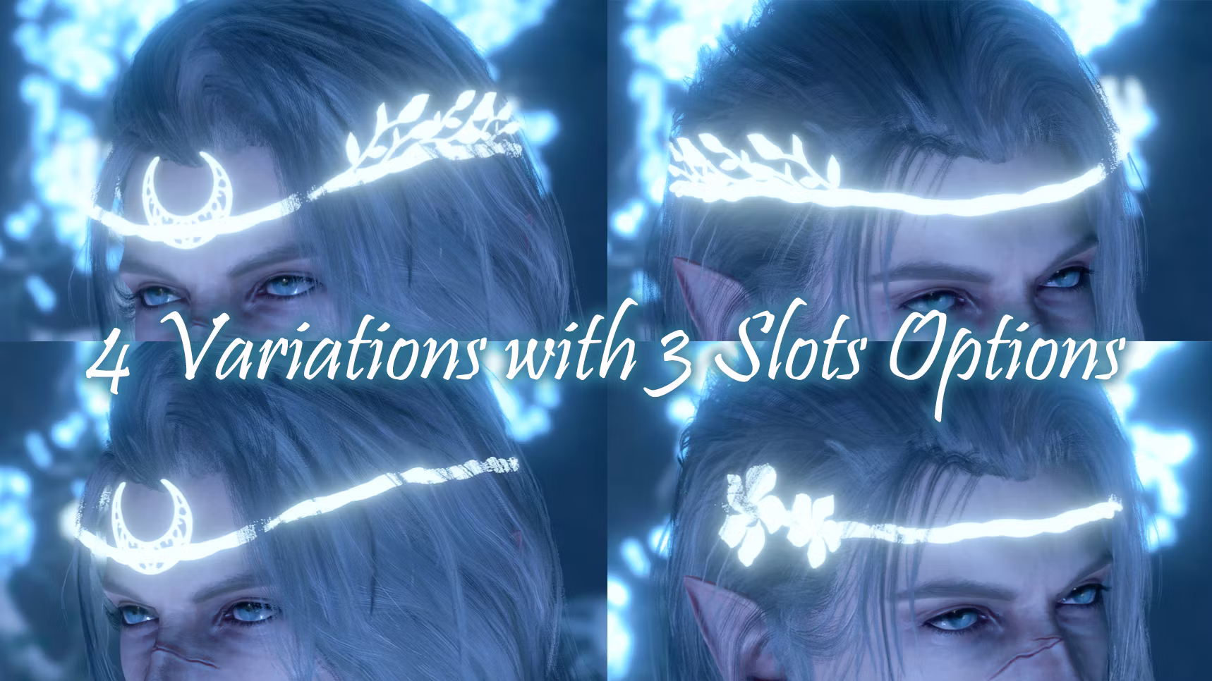 有四种变体和三种槽位选项:一种包含月亮部分和叶子,一种仅含月亮部分,一种仅含叶子,还有一种带有夹竹桃花。每种变体都有头盔/斗篷/内衣槽位选项。不幸的是这些饰品无法染色(如果要制作其他颜色的变体将会是一项巨大的工作量 lol)你可以在教程箱中找到它们(只需使用教程箱召唤模组即可)。