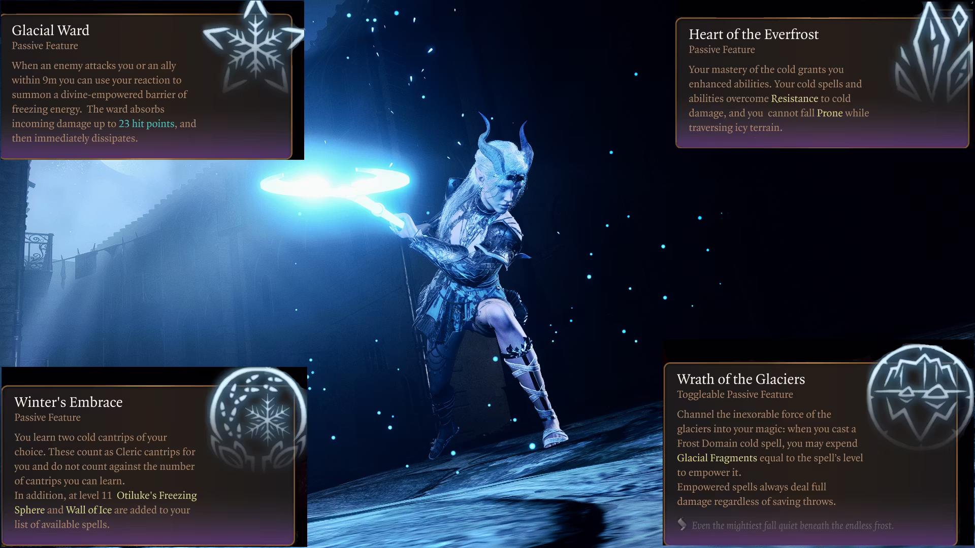 当敌人攻击你或距离你在9米内的盟友时,你可以使用你的反应召唤一个由神力强化的冻结能量屏障。该屏障可以吸收最高为等级 + 智慧调整值的伤害,并在吸收完毕后立即消失。