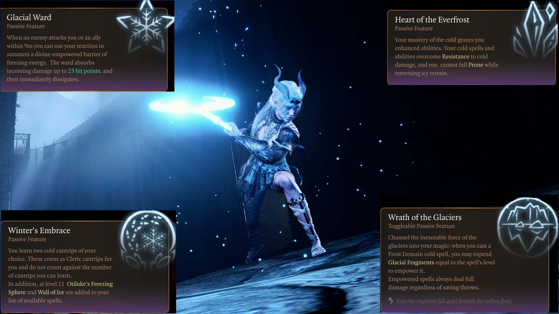 当敌人攻击你或距离你在9米内的盟友时,你可以使用你的反应召唤一个由神力强化的冻结能量屏障。该屏障可以吸收最高为等级 + 智慧调整值的伤害,并在吸收完毕后立即消失。