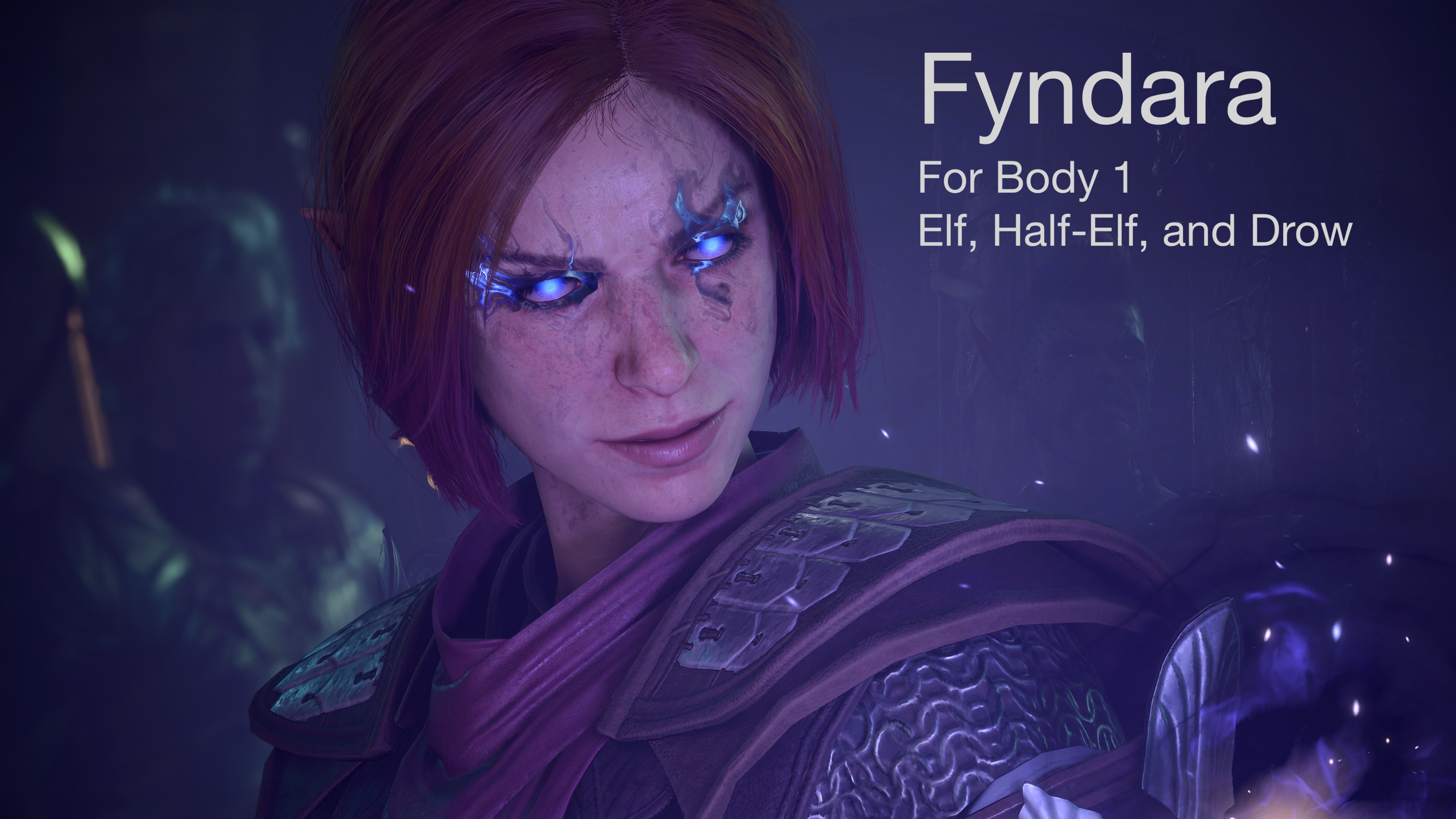 此简单模组为体型1的精灵、半精灵和杜垩福特种族的角色创建添加了费伦最好的面部。已经移除了角,并将牙齿编辑成了标准的人类牙齿。我希望能最终将其添加到人类种族中。