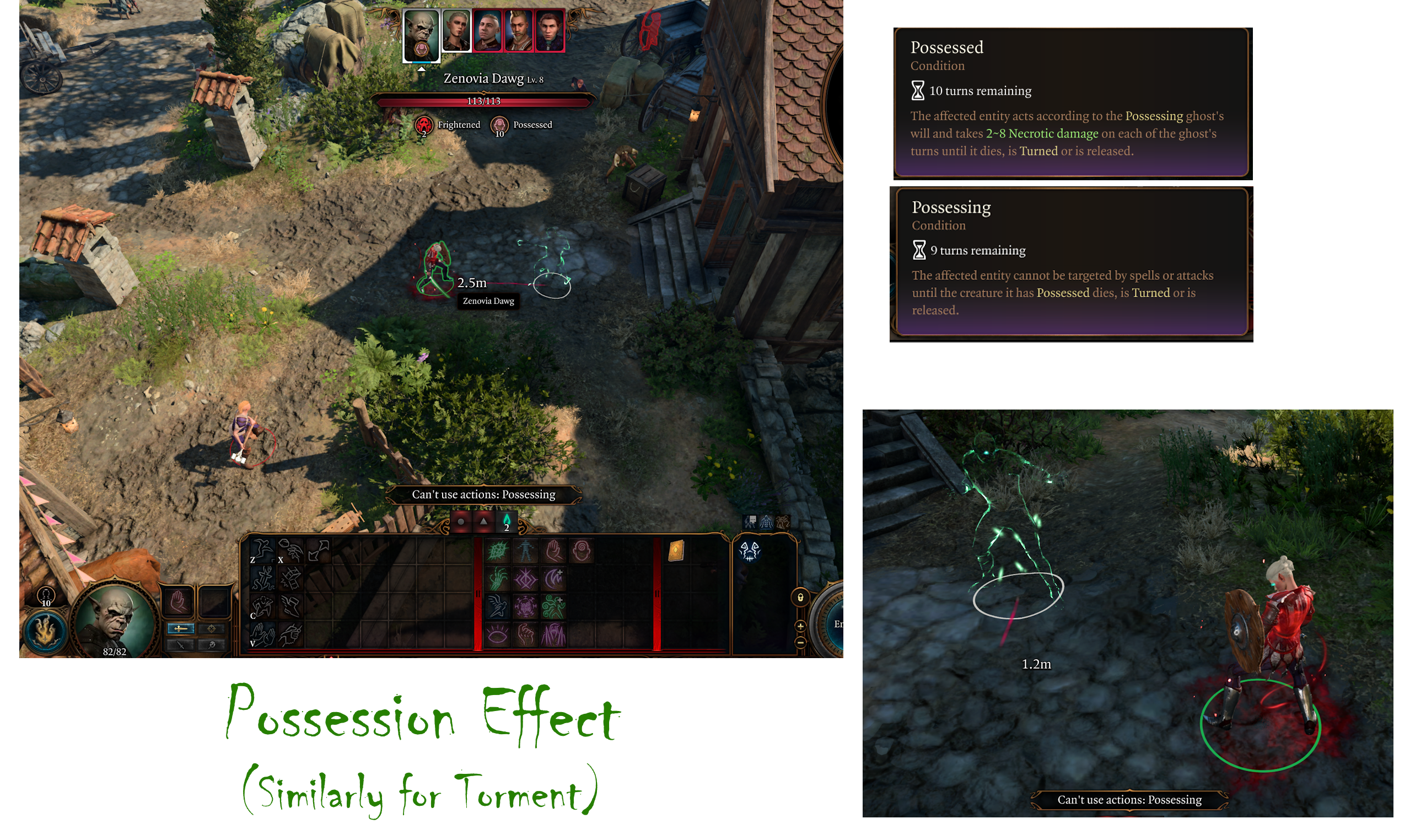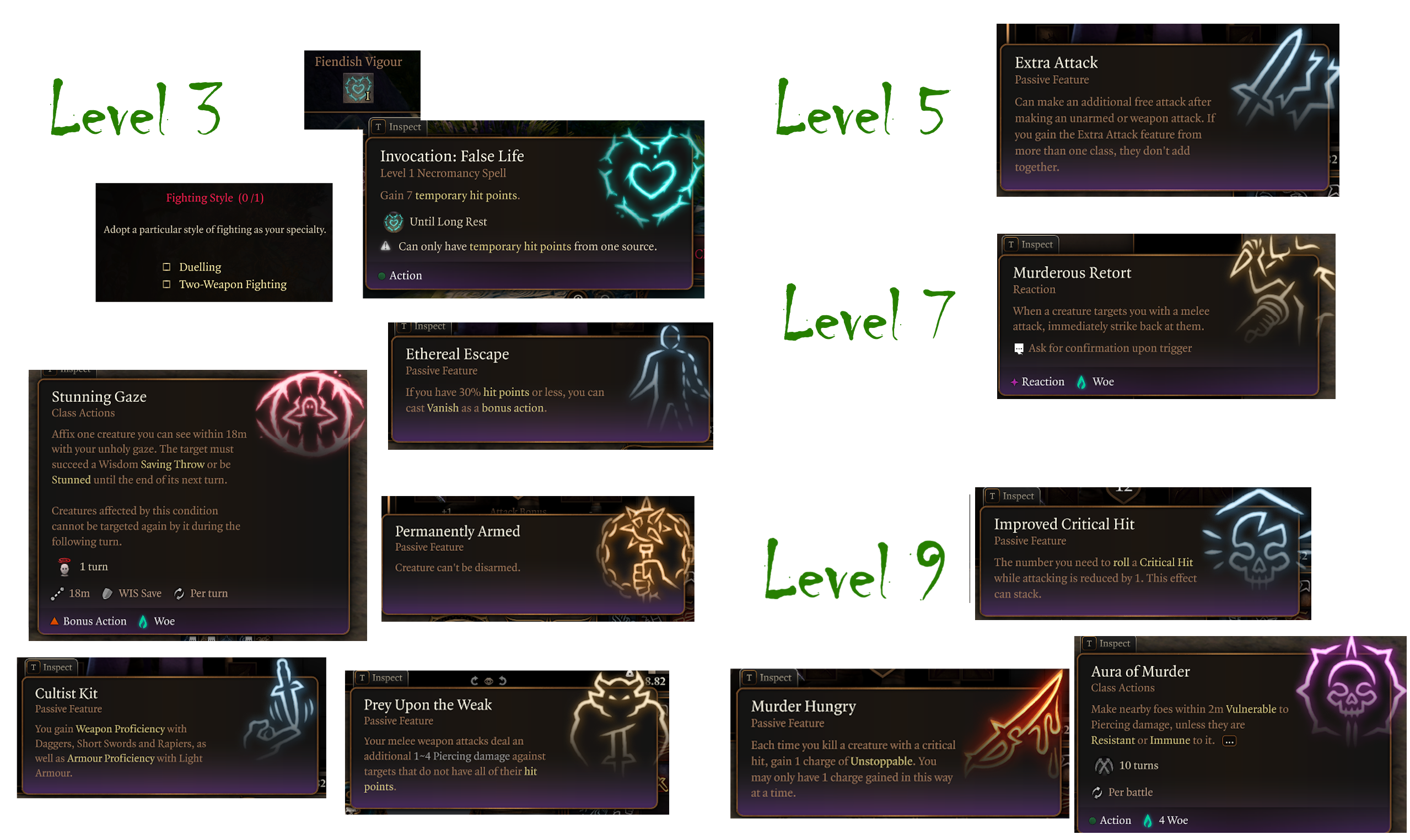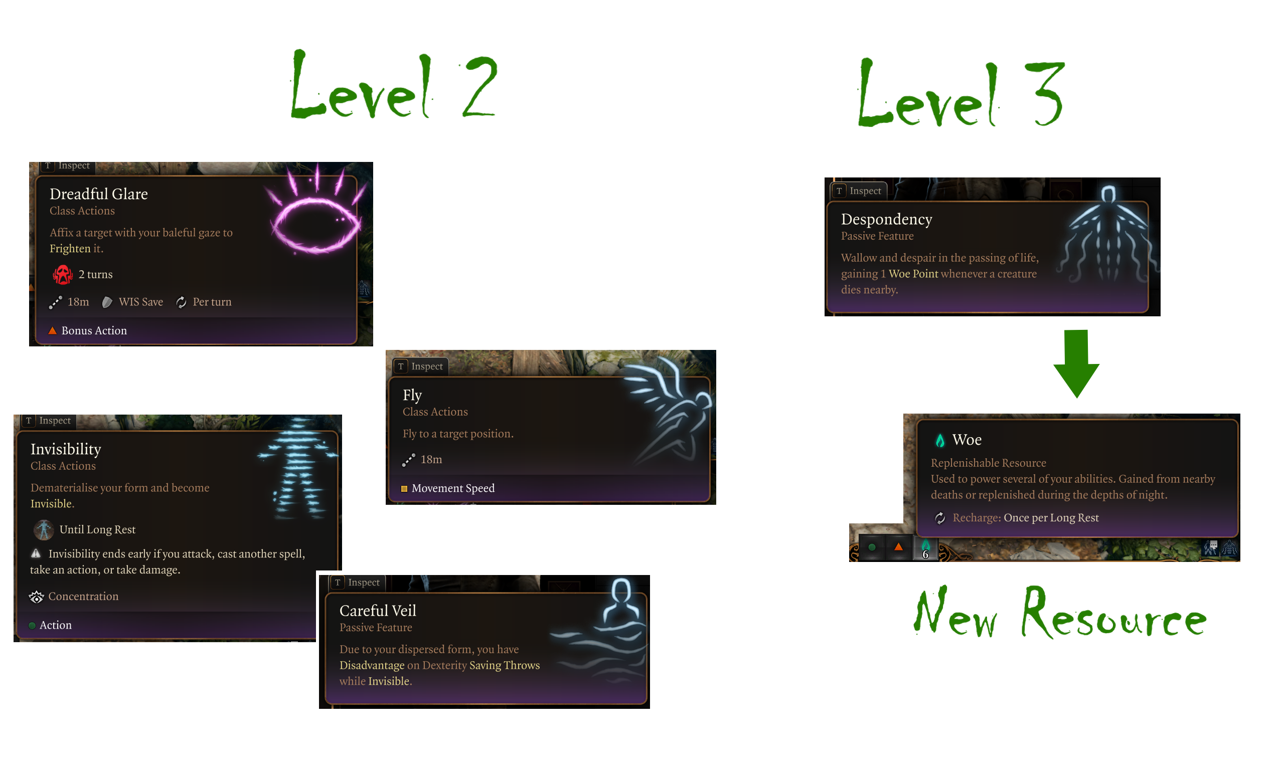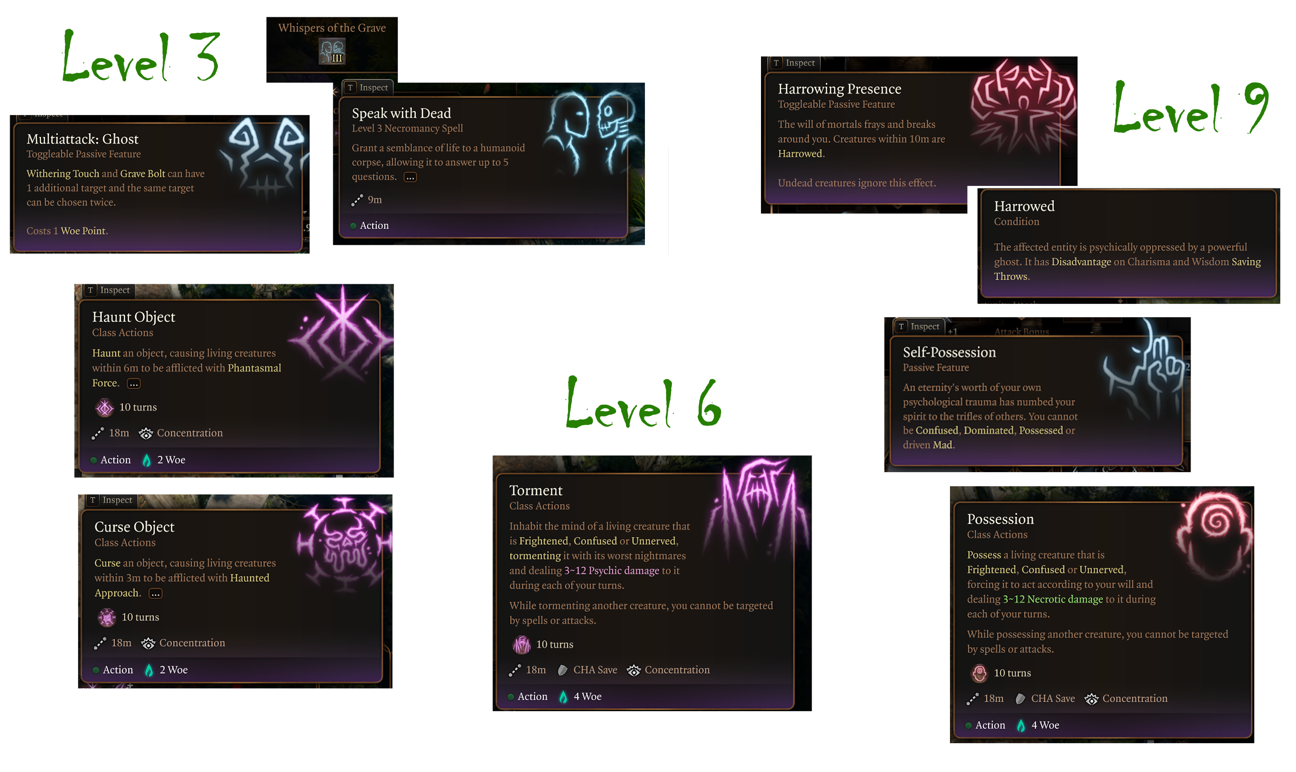 几乎所有的能力都改编自《博德之门》中各种幽灵所使用的能力,少数例外和新增功能除外。大多数能力已经进行了调整,并重新平衡了伤害值以更好地作为可玩职业。一些技能还基于新的资源系统“苦难”(Woe)运作。请参见上方图片中的游戏内描述以及下方的更多解释。