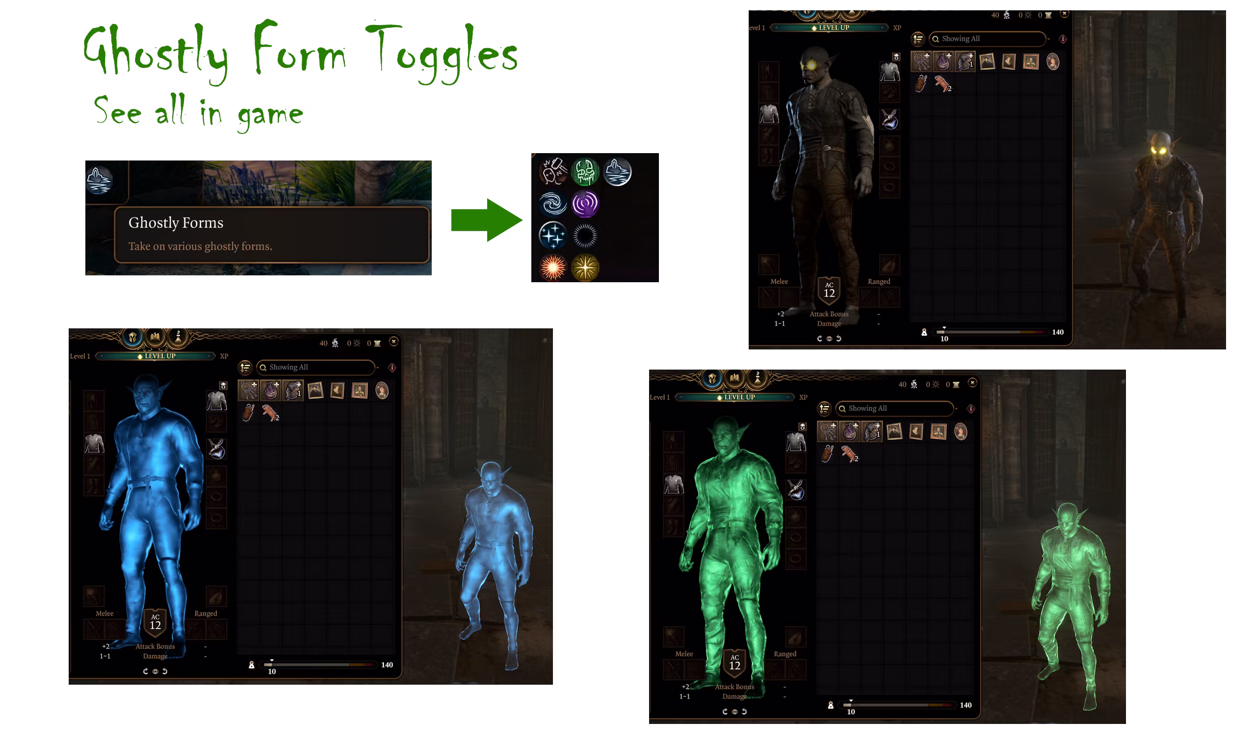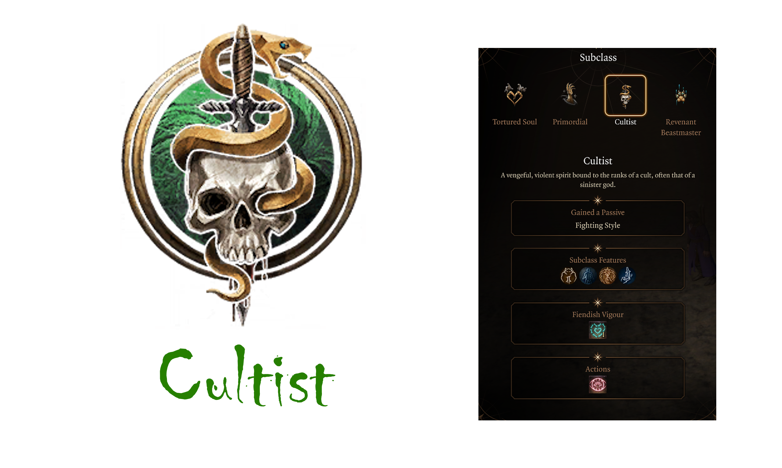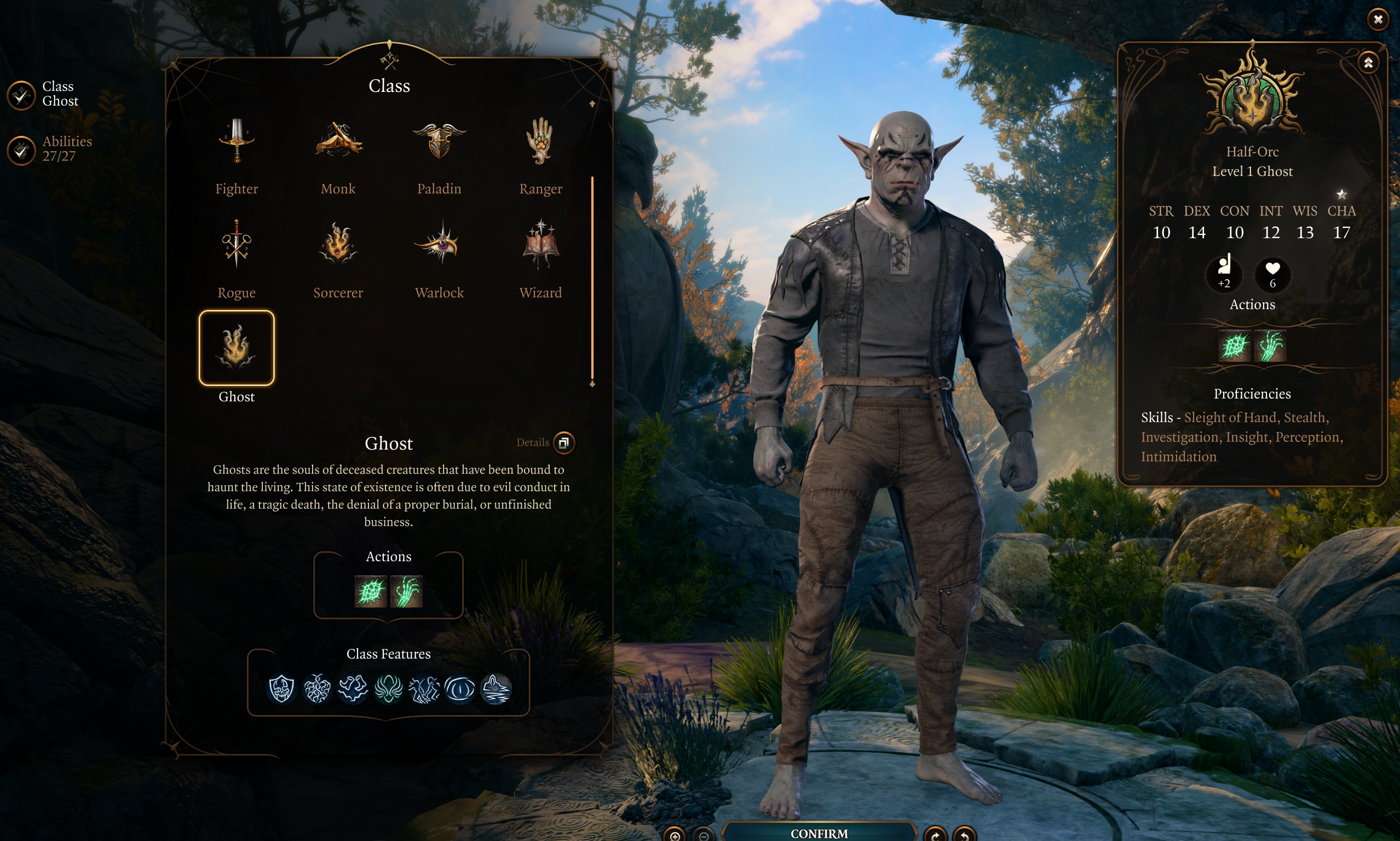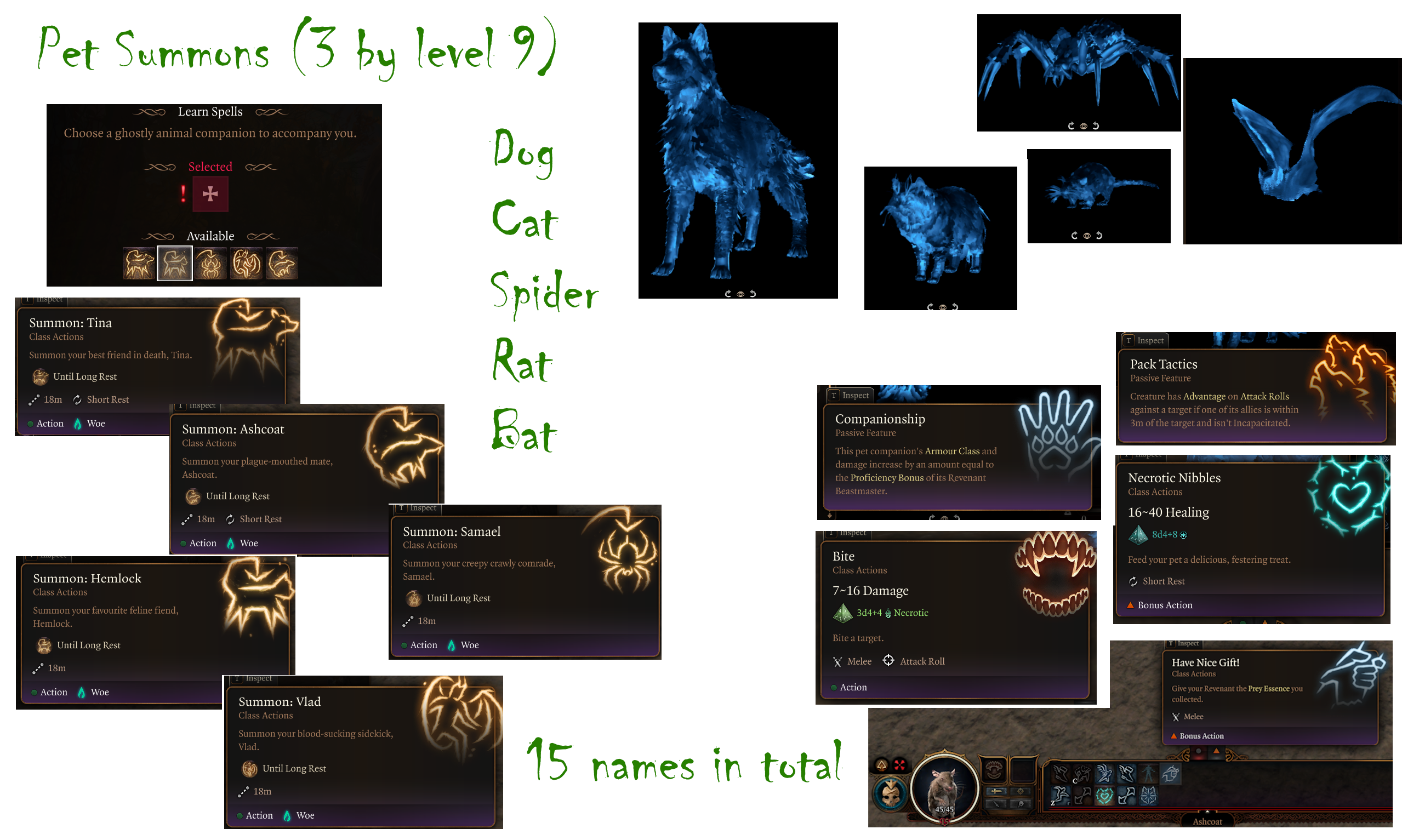几乎所有的能力都改编自《博德之门》中各种幽灵所使用的能力,少数例外和新增功能除外。大多数能力已经进行了调整,并重新平衡了伤害值以更好地作为可玩职业。一些技能还基于新的资源系统“苦难”(Woe)运作。请参见上方图片中的游戏内描述以及下方的更多解释。
