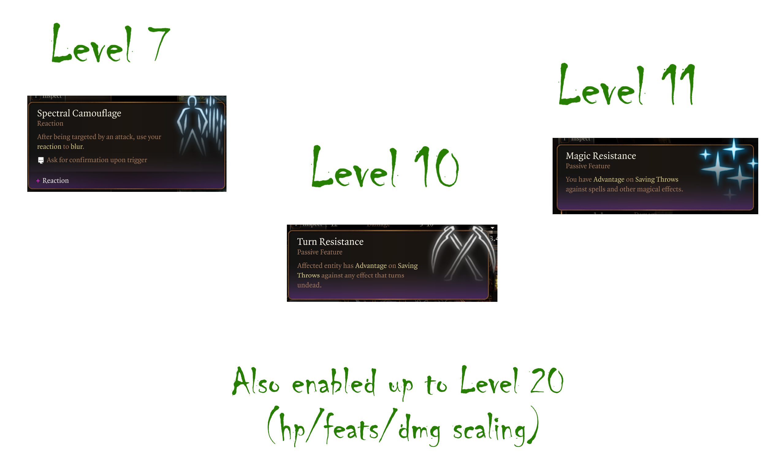 为12级游戏设计,但如果您使用了支持20级的游戏模组,则可以启用到20级。几乎所有能力都基于法术伤害进行调整,并且在达到12级后仍会继续增加,前提是您使用的20级模组已正确实现。