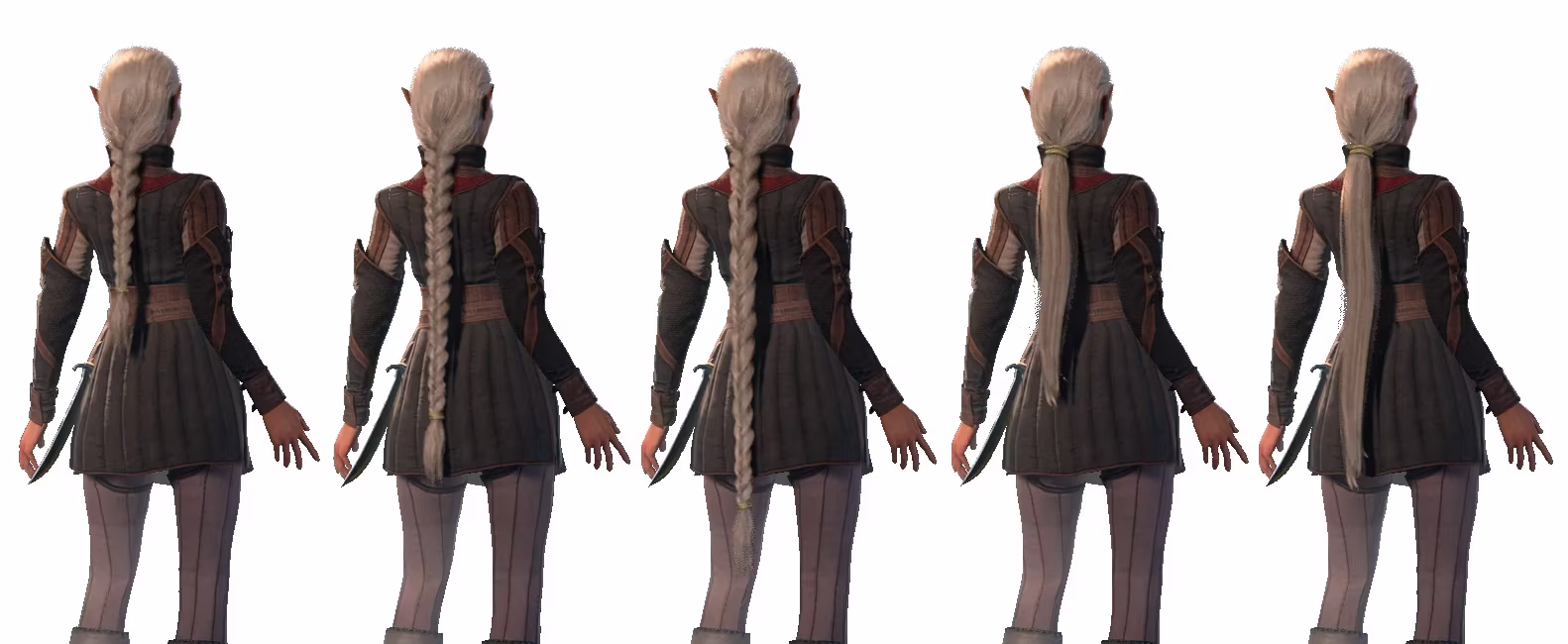 此模组添加了两种简单的发型,一种是束起的辫子,另一种是低马尾。这两种发型各有三种版本,分别配有金色、银色或皮革材质的绑带。辫子有三种长度选项,而马尾则有两种。