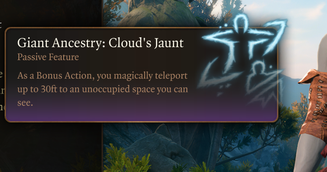 - 云之跳跃(云巨人): 作为奖励动作,你可以魔法传送至多30英尺到一个你能看到的空闲空间。