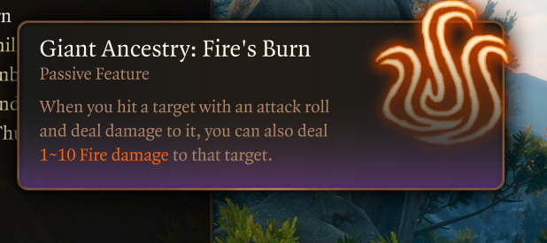 - 火之灼烧(火巨人): 当你用攻击掷骰击中目标并对其造成伤害时,你可以额外对该目标造成1d10火焰伤害。