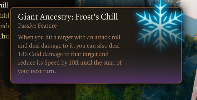 - 霜之寒冰(霜巨人): 当你用攻击掷骰击中目标并对其造成伤害时,你可以额外对该目标造成1d6寒冷伤害,并将其速度减少10英尺直到你的下一个回合开始。