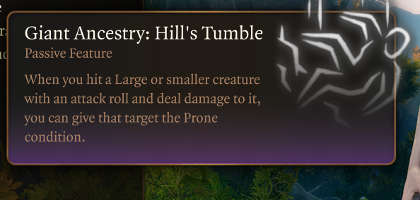 - 山之翻滚(山巨人): 当你击中一个大型生物或物体时,你可以进行一次敏捷检定来决定是否可以翻滚过去而不受到任何伤害。