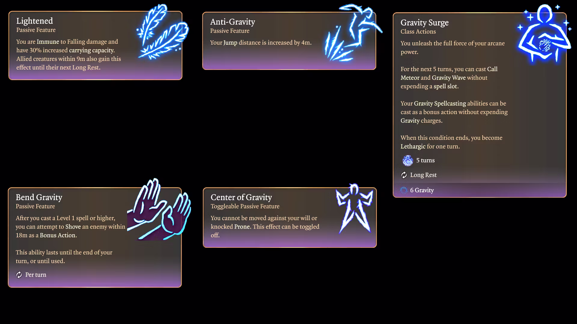- 引力法术: 你获得 奇点 法术,以及 解除武器、压制和跳跃 等引力法术能力。引力法术能力消耗的是重力电荷而不是法术位。